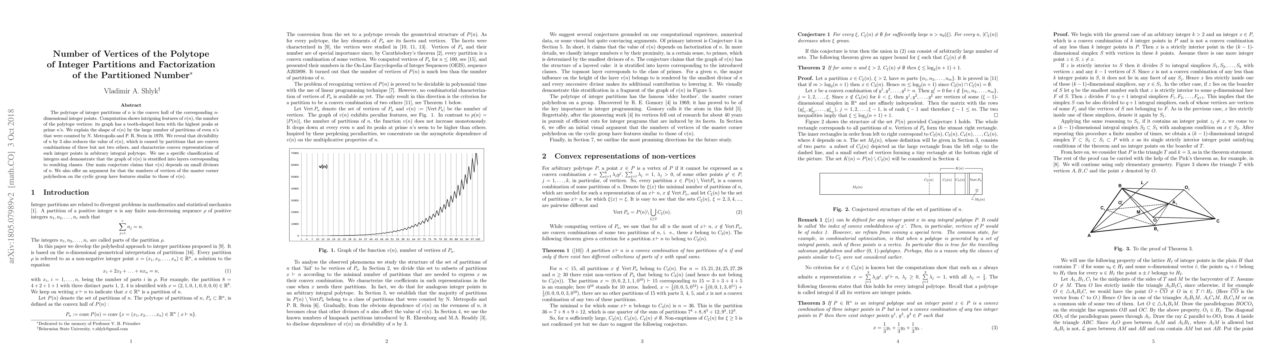 The polytope of integer partitions of $n$ is the convex hull of the corresponding $n$-dimensional integer points. Its vertices are of importance because every partition is their convex combination. Computation shows intriguing features of $v(n),$ the number of the polytope vertices: its graph has a saw-toothed shape with the highest peaks at prime $n$'s. We explain the shape of $v(n)$ by the large number of partitions of even $n$'s that were counted by N. Metropolis and P. R. Stein. These partitions are convex combinations of two others. We reveal that divisibility of $n$ by 3 also reduces the value of $v(n),$ which is caused by partitions that are convex combinations of three but not two others, and characterize convex representations of such integer points in arbitrary integral polytope. To approach the prime $n$ phenomenon, we use a specific classification of integers and demonstrate that the graph of $v(n)$ is stratified to layers corresponding to resulting classes. Our main conjecture claims that $v(n)$ depends on collections of divisors of $n.$ We also offer an initial argument for that the number of vertices of the Gomory's master corner polyhedron on the cyclic group has features similar to those of $v(n).$