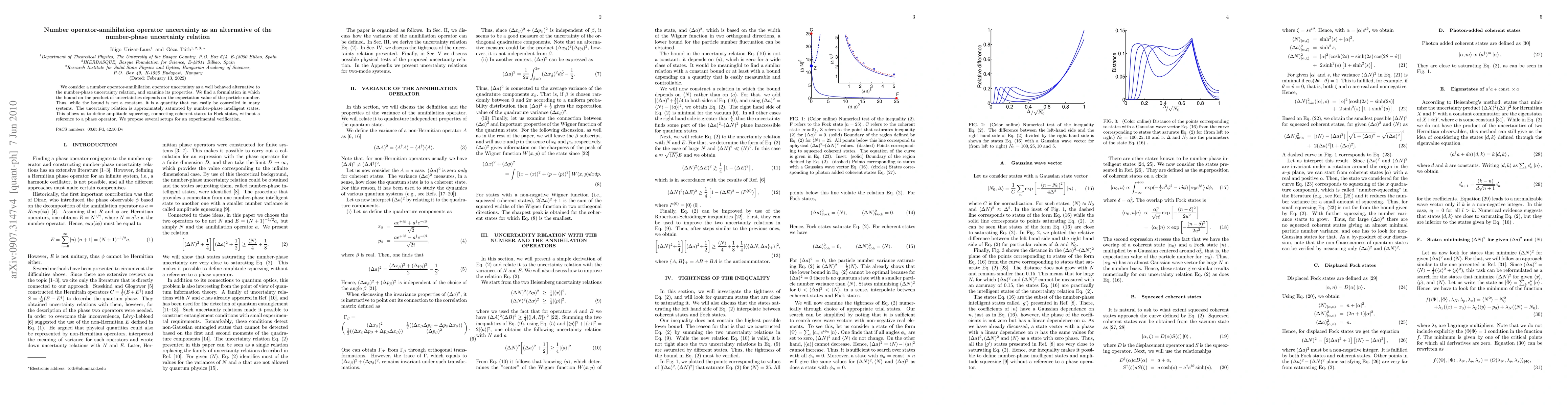 We consider a number operator-annihilation operator uncertainty as a well behaved alternative to the number-phase uncertainty relation, and examine its properties. We find a formulation in which the bound on the product of uncertainties depends on the expectation value of the particle number. Thus, while the bound is not a constant, it is a quantity that can easily be controlled in many systems. The uncertainty relation is approximately saturated by number-phase intelligent states. This allows us to define amplitude squeezing, connecting coherent states to Fock states, without a reference to a phase operator. We propose several setups for an experimental verification.