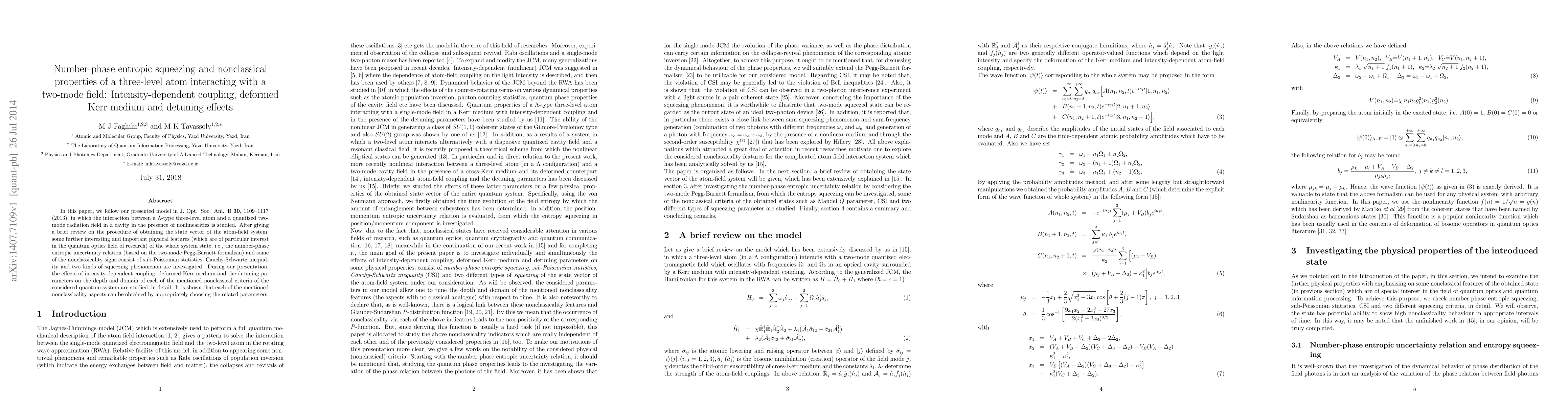 This paper investigates the nonclassical properties and number-phase entropic squeezing of a $\Lambda$-type three-level atom interacting with a two-mode radiation field under various conditions, including intensity-dependent coupling, deformed Kerr medium, and detuning effects. The study explores sub-Poissonian statistics, Cauchy-Schwartz inequality, and two types of squeezing, demonstrating how parameter choices can enhance these nonclassical features.