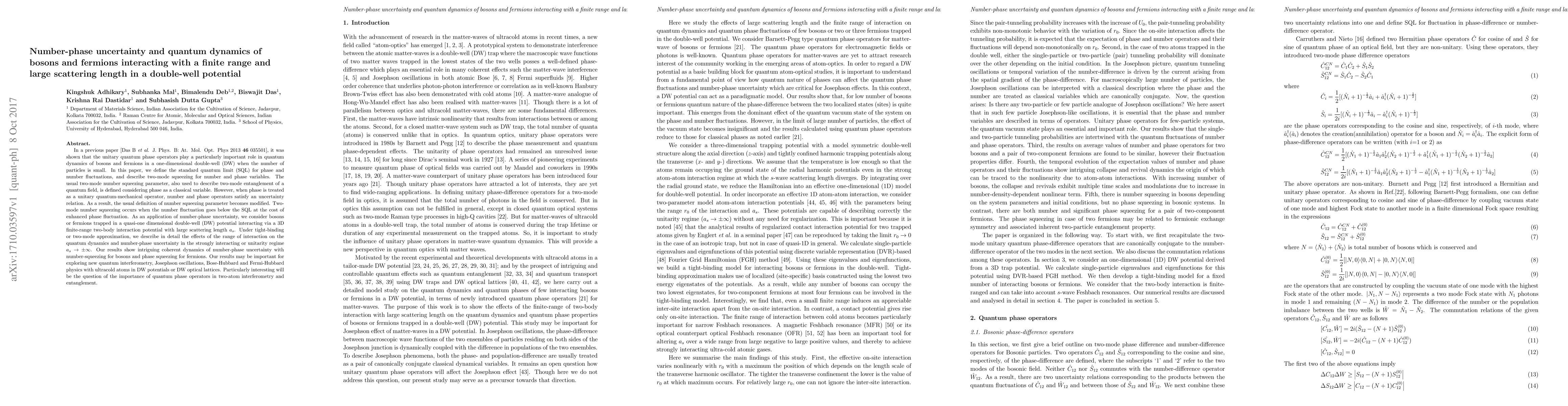 This paper explores the quantum dynamics of bosons and fermions in a double-well potential under finite-range interactions with large scattering length, focusing on number-phase uncertainty and its implications. It reveals modified number squeezing and phase squeezing dynamics, with potential applications in quantum interferometry and ultracold atom systems.
