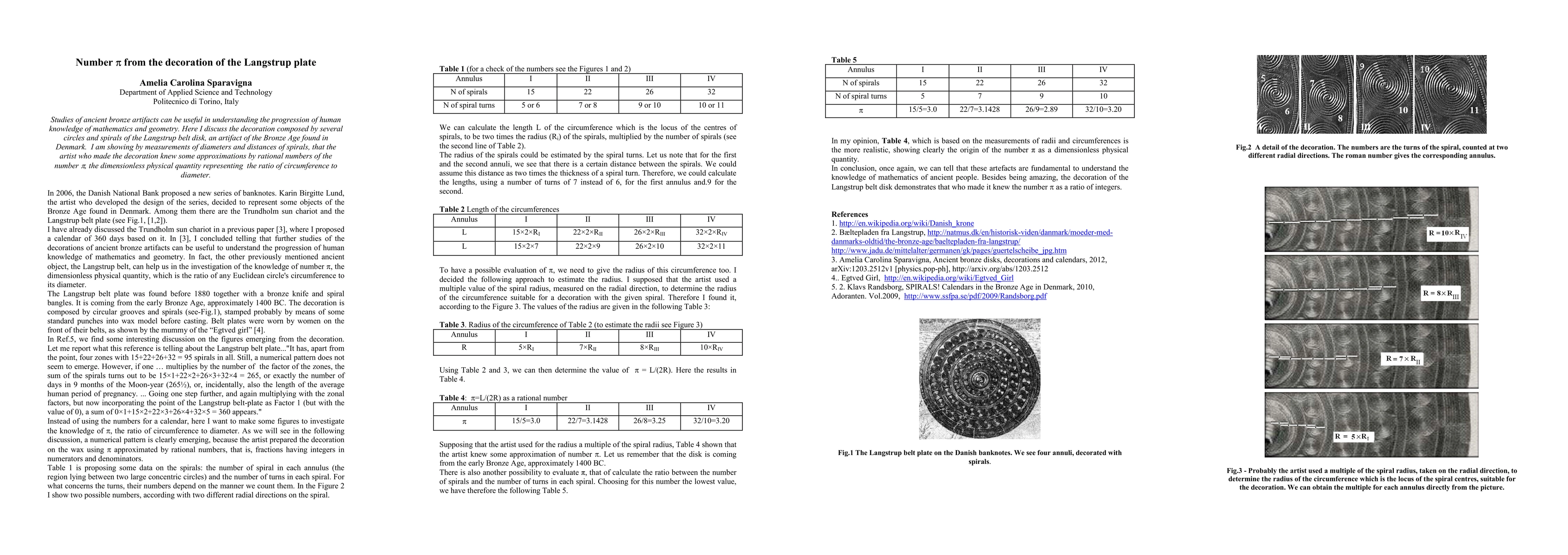 Studies of ancient bronze artifacts can be useful in understanding the progression of human knowledge of mathematics and geometry. Here I discuss the decoration composed by several circles and spirals of the Langstrup belt disk, an artifact of the Bronze Age found in Denmark. I am showing by measurements of diameters and distances of spirals, that the artist who made the decoration knew some approximations by rational numbers of the number pi, the dimensionless physical quantity representing the ratio of circumference to diameter.