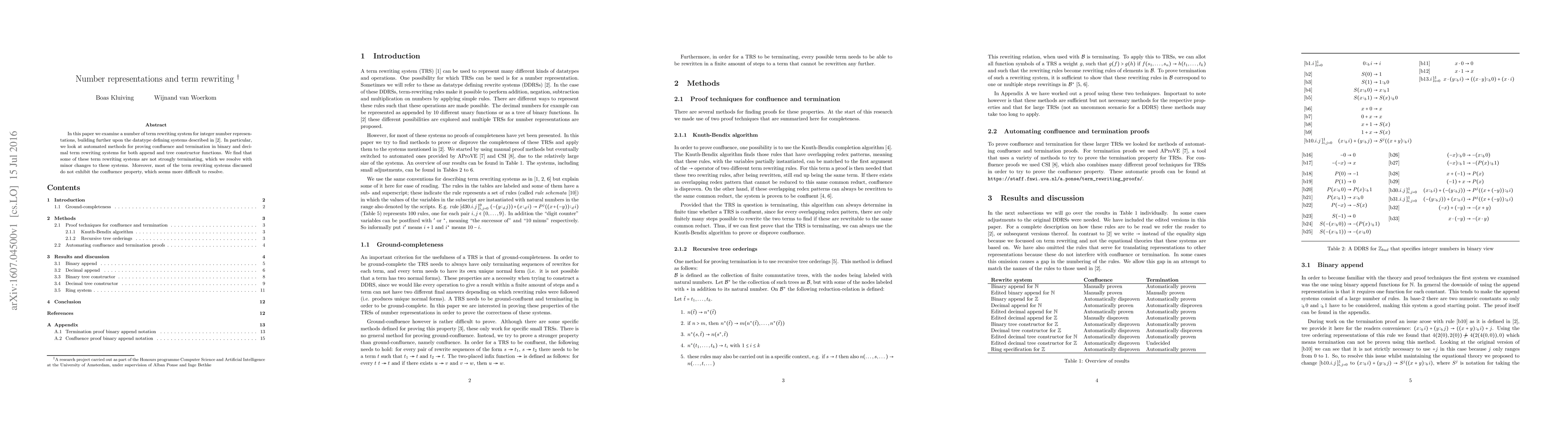 In this paper we examine a number of term rewriting system for integer number representations, building further upon the datatype defining systems described in [2]. In particular, we look at automated methods for proving confluence and termination in binary and decimal term rewriting systems for both append and tree constructor functions. We find that some of these term rewriting systems are not strongly terminating, which we resolve with minor changes to these systems. Moreover, most of the term rewriting systems discussed do not exhibit the confluence property, which seems more difficult to resolve.