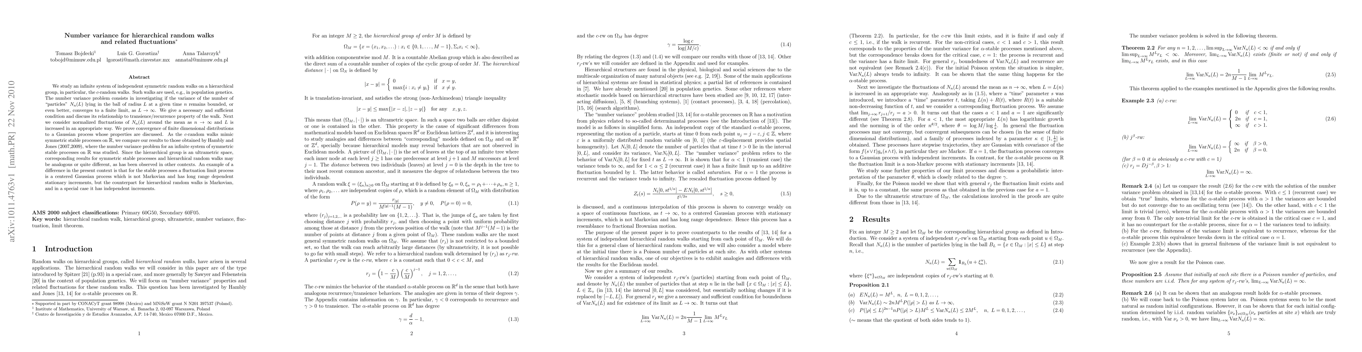 We study an infinite system of independent symmetric random walks on a hierarchical group, in particular, the c-random walks. Such walks are used, e.g., in population genetics. The number variance problem consists in investigating if the variance of the number of "particles" N_n(L) lying in the ball of radius L at a given time n remains bounded, or even better, converges to a finite limit, as $L\to \infty$. We give a necessary and sufficient condition and discuss its relationship to transience/recurrence property of the walk. Next we consider normalized fluctuations of N_n(L) around the mean as $n\to \infty$ and L is increased in an appropriate way. We prove convergence of finite dimensional distributions to a Gaussian process whose properties are discussed. As the c-random walks mimic symmetric stable processes on R, we compare our results to those obtained by Hambly and Jones (2007,2009), where the number variance problem for an infinite system of symmetric stable processes on R was studied. Since the hierarchical group is an ultrametric space, corresponding results for symmetric stable processes and hierarchical random walks may be analogous or quite different, as has been observed in other contexts. An example of a difference in the present context is that for the stable processes a fluctuation limit process is a centered Gaussian process which is not Markovian and has long range dependent stationary increments, but the counterpart for hierarchical random walks is Markovian, and in a special case it has independent increments.
