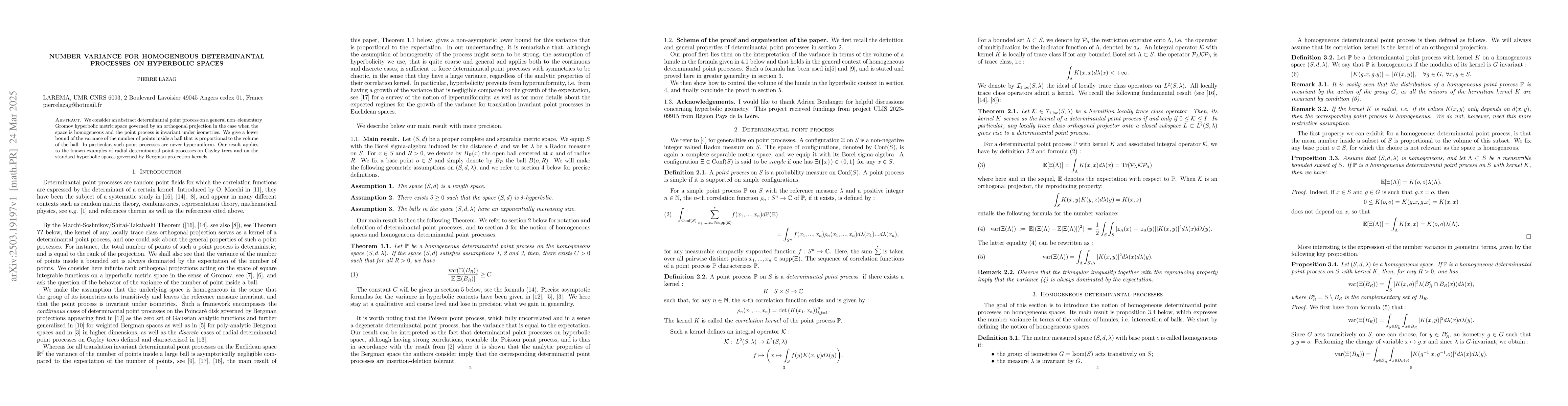 The paper provides a formula for the number variance in terms of the volume of a lune (intersection of two balls) for homogeneous determinantal processes on hyperbolic spaces, along with a proof of their non-hyperuniformity.