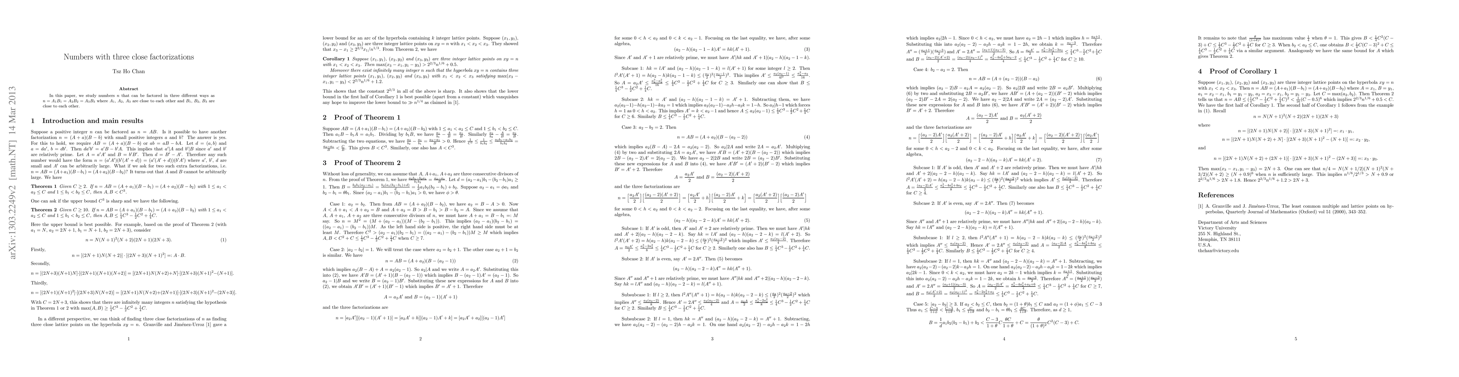 In this paper, we study numbers $n$ that can be factored in three different ways as $n = A_1 B_1 = A_2 B_2 = A_3 B_3$ where $A_1$, $A_2$, $A_3$ are close to each other and $B_1$, $B_2$, $B_3$ are close to each other.