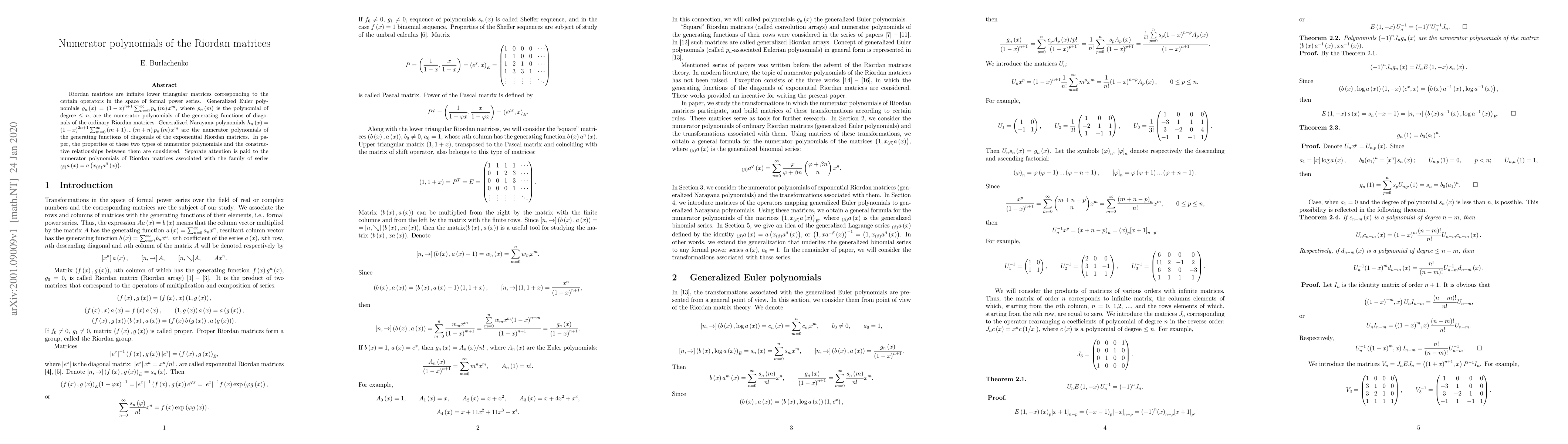 Riordan matrices are infinite lower triangular matrices corresponding to the certain operators in the space of formal power series. Generalized Euler polynomials ${{g}_{n}}\left( x \right)={{\left( 1-x \right)}^{n+1}}\sum\nolimits_{m=0}^{\infty }{{{p}_{n}}}\left( m \right){{x}^{m}}$, where ${{p}_{n}}\left( m \right)$ is the polynomial of degree $\le n$, are the numerator polynomials of the generating functions of diagonals of the ordinary Riordan matrices. Generalized Narayana polynomials ${{h}_{n}}\left( x \right)={{\left( 1-x \right)}^{2n+1}}\sum\nolimits_{m=0}^{\infty }{\left( m+1 \right)...\left( m+n \right){{p}_{n}}}\left( m \right){{x}^{m}}$ are the numerator polynomials of the generating functions of diagonals of the exponential Riordan matrices. In paper, the properties of these two types of numerator polynomials and the constructive relationships between them are considered. Separate attention is paid to the numerator polynomials of Riordan matrices associated with the family of series $_{\left( \beta \right)}a\left( x \right)=a\left( x{}_{\left( \beta \right)}{{a}^{\beta }}\left( x \right) \right)$.