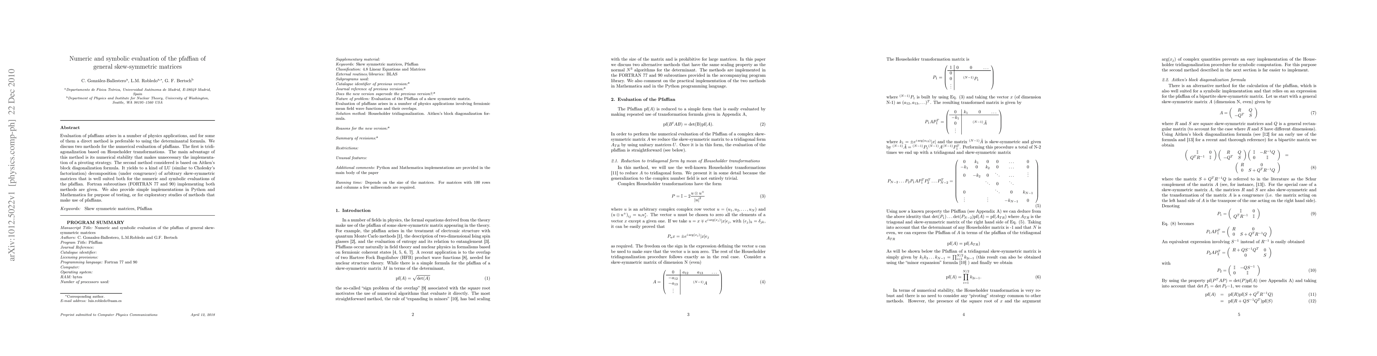 Researchers developed two methods for evaluating pfaffians of general skew-symmetric matrices, one using tridiagonalization with Householder transformations and the other based on Aitken's block diagonalization formula, offering improved numerical stability and efficiency.