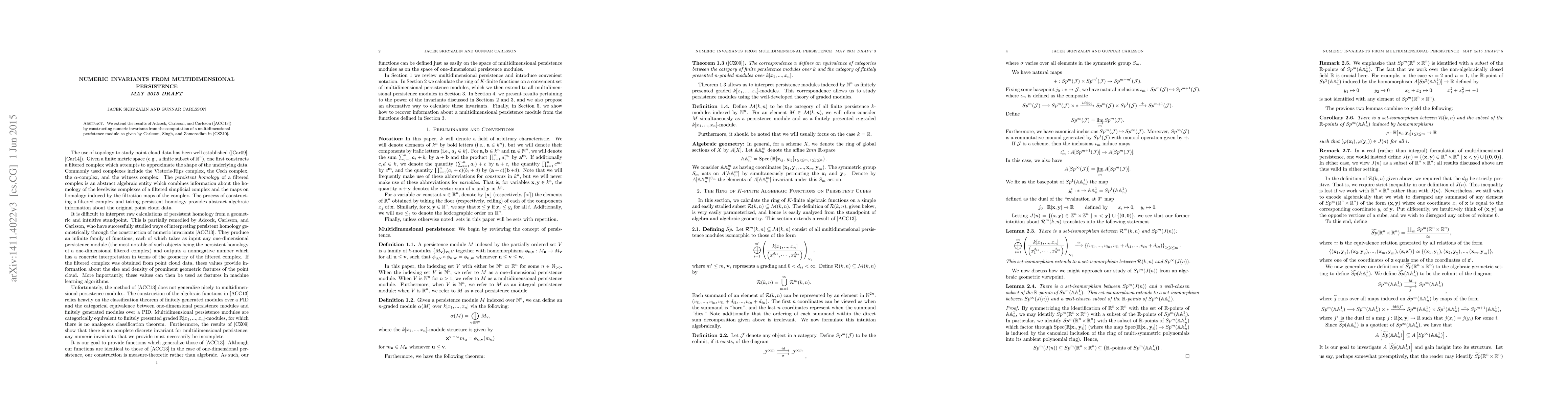 Summary: This paper extends previous work by constructing numeric invariants from multidimensional persistence modules, building on the foundational results of Adcock, Carlsson, and Carlsson, and utilizing the computational framework developed by Carlsson, Singh, and Zomorodian. The focus is on enhancing the understanding and application of these invariants in data analysis.