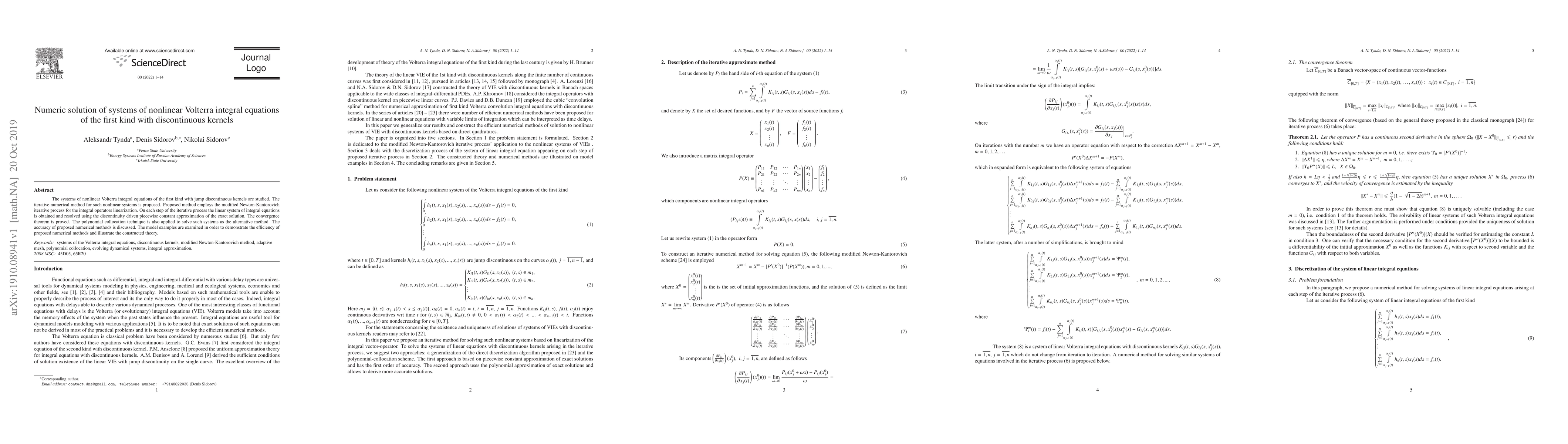 This paper proposes an iterative numerical method for solving nonlinear Volterra integral equations of the first kind with discontinuous kernels, utilizing a modified Newton-Kantorovich process and piecewise constant approximation. The method's convergence is proven, and an alternative polynomial collocation technique is also discussed for accuracy comparison.