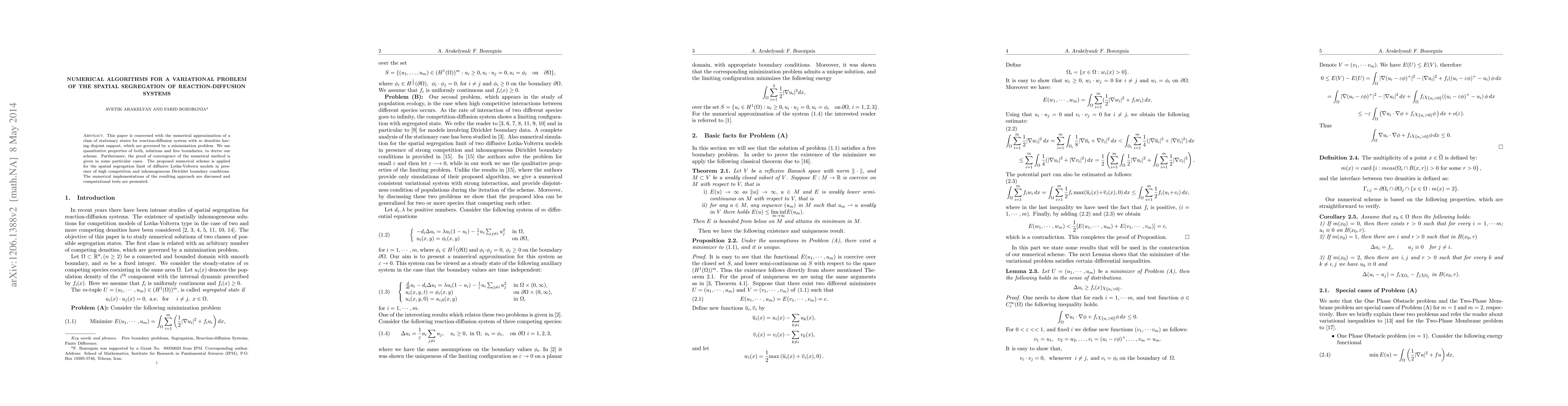 In this paper, we study a numerical approximation for a class of stationary states for reaction-diffusion system with m densities having disjoint support, which are governed by a minimization problem. We use quantitative properties of both solutions and free boundaries to derive our scheme. Furthermore, the proof of convergence of the numerical method is given in some particular cases. We also apply our numerical simulations for the spatial segregation limit of diffusive Lotka-Volterra models in presence of high competition and inhomogeneous Dirichlet boundary conditions. We discuss numerical implementations of the resulting approach and present computational tests.