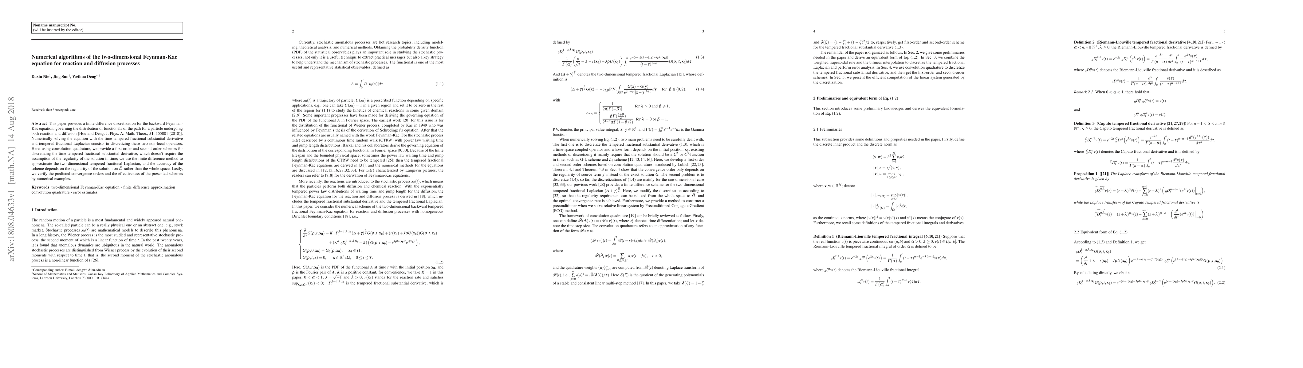 This paper develops finite difference discretization methods for solving the two-dimensional Feynman-Kac equation involving reaction and diffusion processes, employing convolution quadrature for first-order and second-order schemes for the time tempered fractional substantial derivative and finite difference methods for the tempered fractional Laplacian. Numerical examples validate the convergence orders and effectiveness of the proposed schemes.