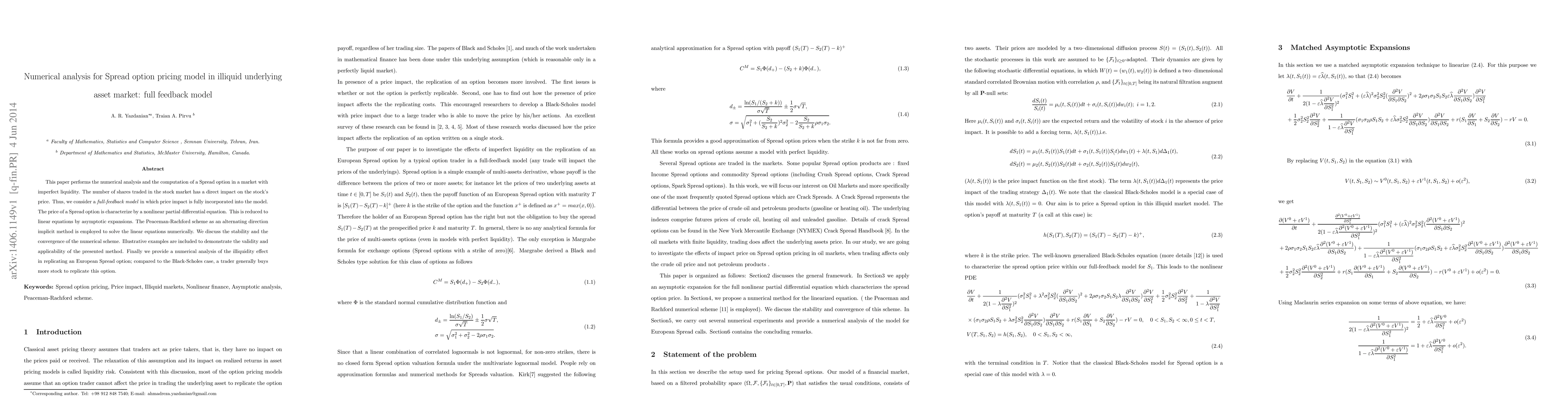 This paper performs the numerical analysis and the computation of a Spread option in a market with imperfect liquidity. The number of shares traded in the stock market has a direct impact on the stock's price. Thus, we consider a full-feedback model in which price impact is fully incorporated into the model. The price of a Spread option is characterize by a nonlinear partial differential equation. This is reduced to linear equations by asymptotic expansions. The Peaceman-Rachford scheme as an alternating direction implicit method is employed to solve the linear equations numerically. We discuss the stability and the convergence of the numerical scheme. Illustrative examples are included to demonstrate the validity and applicability of the presented method. Finally we provide a numerical analysis of the illiquidity effect in replicating an European Spread option; compared to the Black-Scholes case, a trader generally buys more stock to replicate this option.