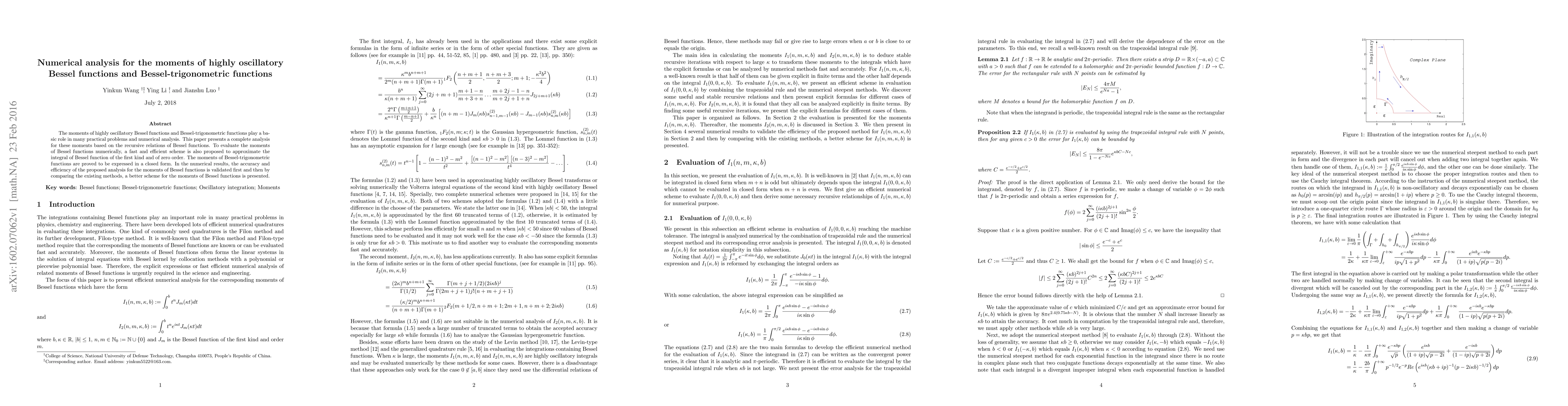 The moments of Bessel functions and Bessel-trigonometric functions play a basic role in many practical problems and numerical analysis. This paper presents a complete analysis for these moments based on the recursive relations of Bessel functions. To evaluate the moments of Bessel functions numerically, a fast and efficient scheme is also proposed to approximate the integral of Bessel function of the first kind and of zero order. The moments of Bessel-trigonometric functions are proved to be expressed in a closed form. In the numerical results, the accuracy and efficiency of the proposed analysis for the moments of Bessel functions is validated first and then by comparing the existing methods, a better scheme for the moments of Bessel functions is presented.