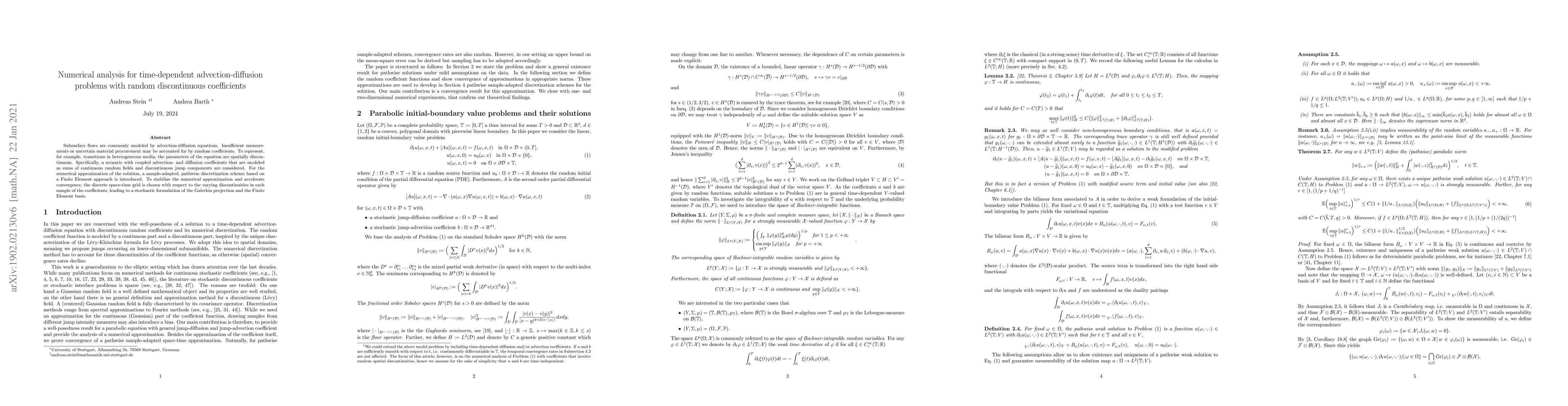 Subsurface flows are commonly modeled by advection-diffusion equations. Insufficient measurements or uncertain material procurement may be accounted for by random coefficients. To represent, for example, transitions in heterogeneous media, the parameters of the equation are spatially discontinuous. Specifically, a scenario with coupled advection- and diffusion coefficients that are modeled as sums of continuous random fields and discontinuous jump components are considered. For the numerical approximation of the solution, an adaptive, pathwise discretization scheme based on a Finite Element approach is introduced. To stabilize the numerical approximation and accelerate convergence, the discrete space-time grid is chosen with respect to the varying discontinuities in each sample of the coefficients, leading to a stochastic formulation of the Galerkin projection and the Finite Element basis.