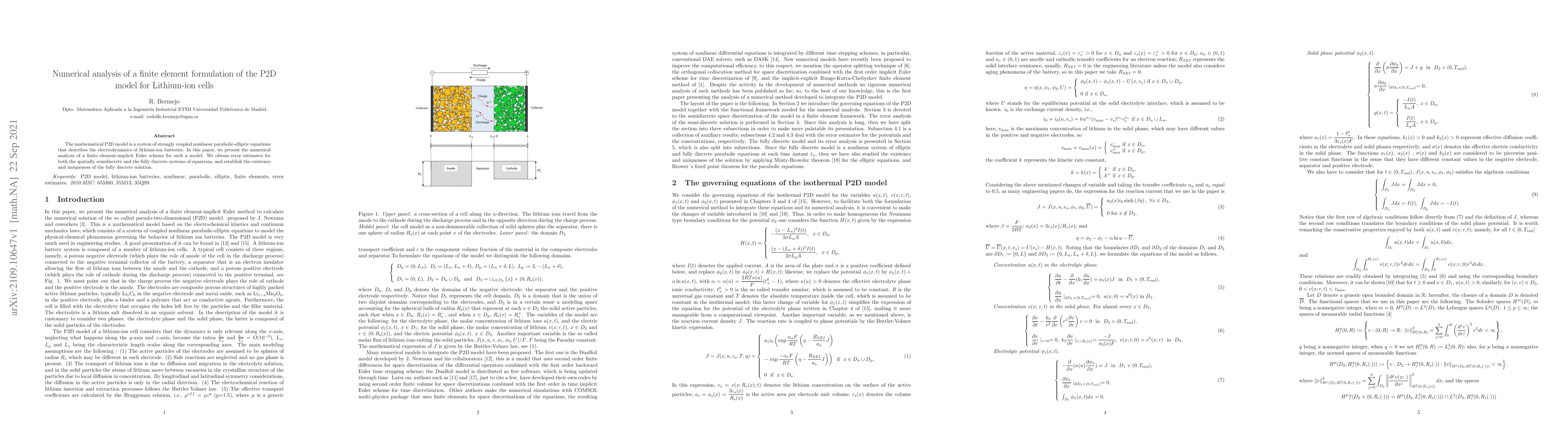 This paper numerically analyzes a finite element-implicit Euler scheme for the P2D model of lithium-ion batteries, providing error estimates and proving the existence and uniqueness of the fully discrete solution.