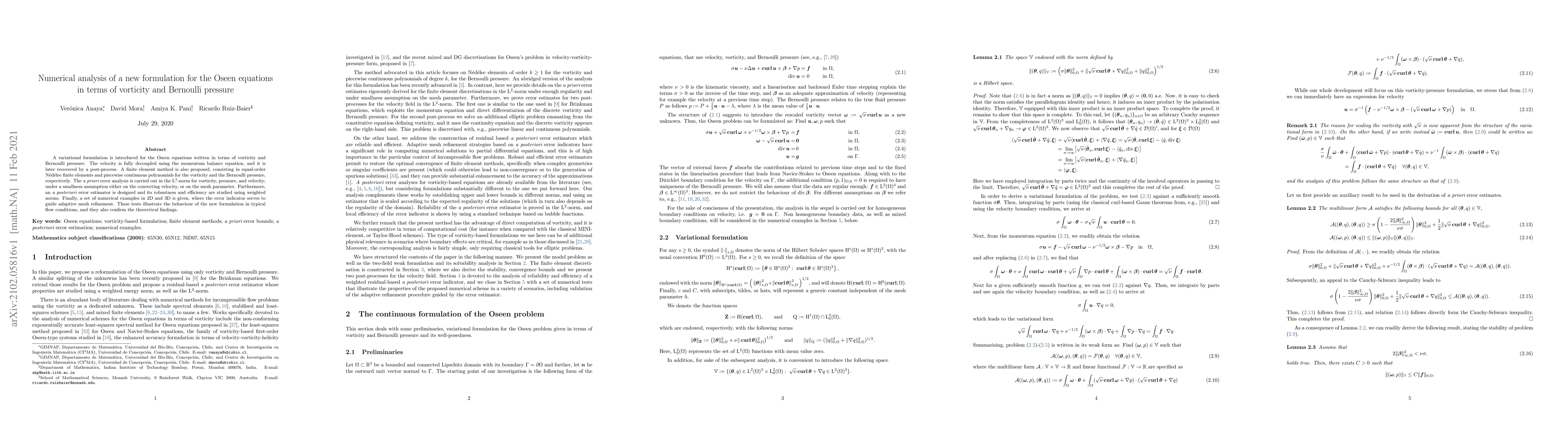 This paper introduces a variational formulation for the Oseen equations using vorticity and Bernoulli pressure, decoupling velocity through the momentum balance. A finite element method employing N\'ed\'elec elements and continuous polynomials is proposed, with rigorous {\it a priori} and {\it a posteriori} error analysis, and validated through numerical examples demonstrating adaptive mesh refinement.