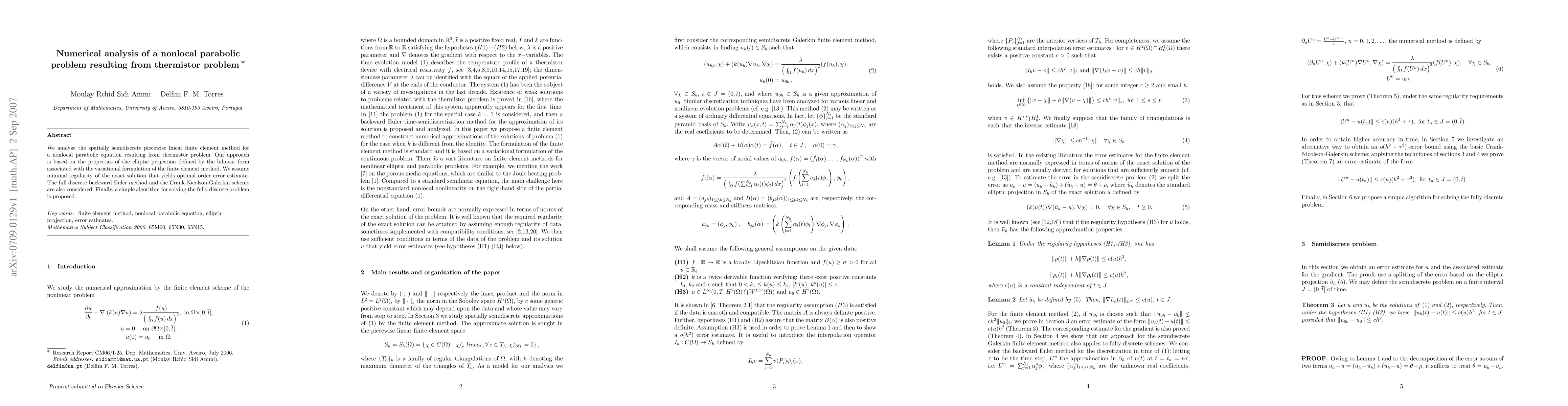 This paper analyzes the piecewise linear finite element method for a nonlocal parabolic equation arising from thermistor problems, focusing on optimal error estimates under minimal regularity assumptions. It also explores the full discrete backward Euler and Crank-Nicolson-Galerkin schemes, and proposes an algorithm for solving the fully discrete problem.