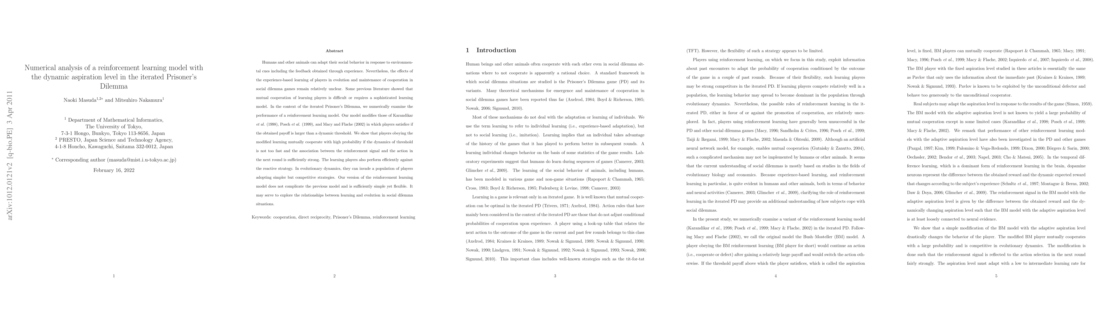 Humans and other animals can adapt their social behavior in response to environmental cues including the feedback obtained through experience. Nevertheless, the effects of the experience-based learning of players in evolution and maintenance of cooperation in social dilemma games remain relatively unclear. Some previous literature showed that mutual cooperation of learning players is difficult or requires a sophisticated learning model. In the context of the iterated Prisoner's Dilemma, we numerically examine the performance of a reinforcement learning model. Our model modifies those of Karandikar et al. (1998), Posch et al. (1999), and Macy and Flache (2002) in which players satisfice if the obtained payoff is larger than a dynamic threshold. We show that players obeying the modified learning mutually cooperate with high probability if the dynamics of threshold is not too fast and the association between the reinforcement signal and the action in the next round is sufficiently strong. The learning players also perform efficiently against the reactive strategy. In evolutionary dynamics, they can invade a population of players adopting simpler but competitive strategies. Our version of the reinforcement learning model does not complicate the previous model and is sufficiently simple yet flexible. It may serve to explore the relationships between learning and evolution in social dilemma situations.