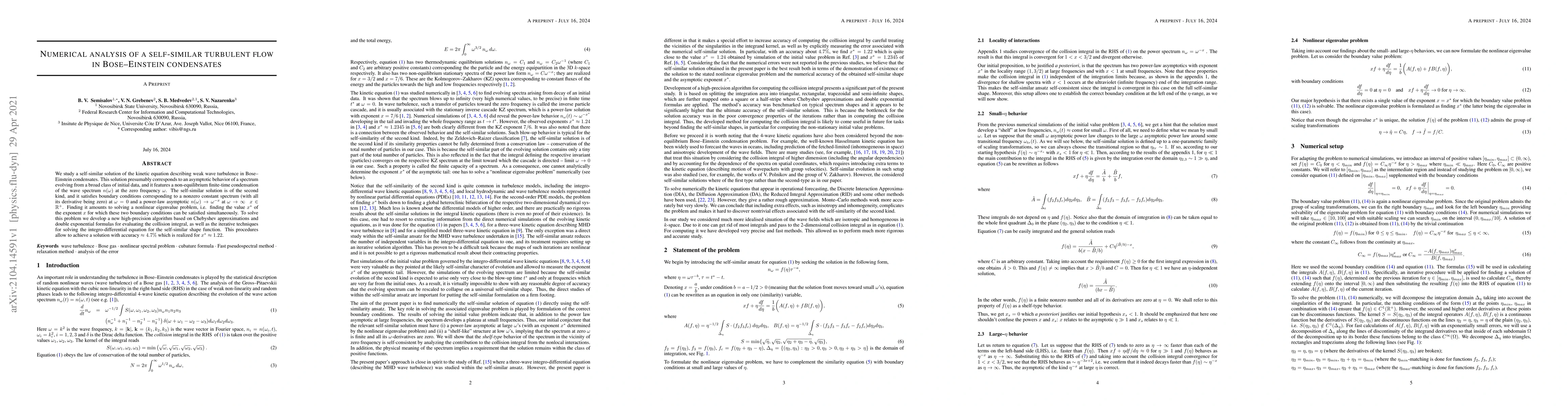 Researchers studied a self-similar turbulent flow in Bose-Einstein condensates, solving a nonlinear eigenvalue problem to find the shape function that describes its behavior, achieving an accuracy of approximately 4.7% for x^* = 1.22.