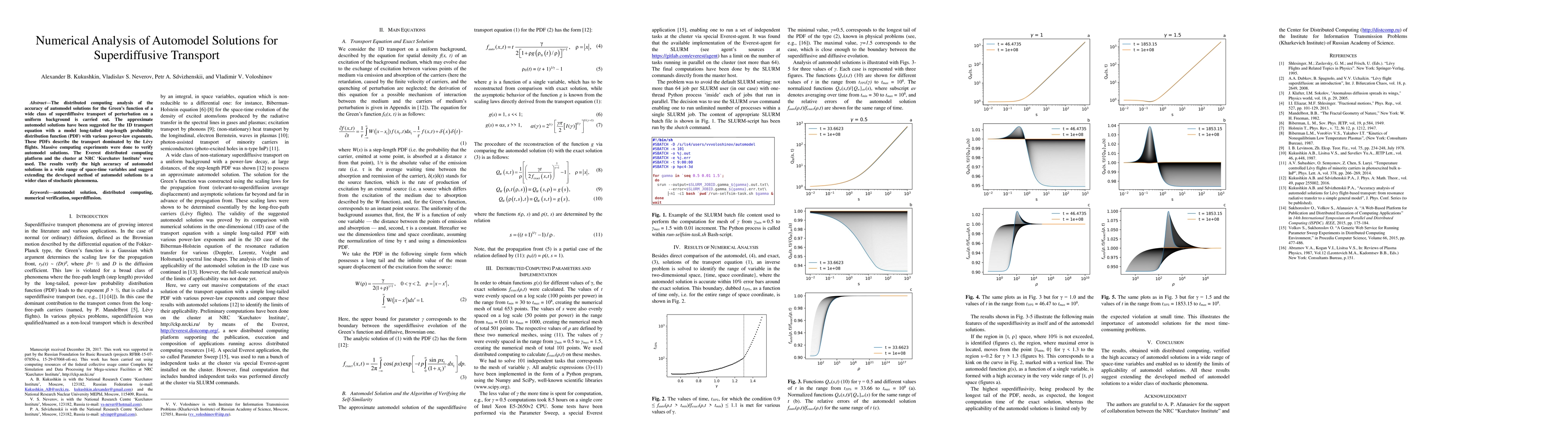 The distributed computing analysis of the accuracy of automodel solutions for the Green's function of a wide class of superdiffusive transport of perturbation on a uniform background is carried out. The approximate automodel solutions have been suggested for the 1D transport equation with a model long-tailed step-length probability distribution function (PDF) with various power-law exponents. These PDFs describe the transport dominated by the L\'evy flights. Massive computing experiments were done to verify automodel solutions. The Everest distributed computing platform and the cluster at NRC Kurchatov Institute were used. The results verify the high accuracy of automodel solutions in a wide range of space-time variables and suggest extending the developed method of automodel solutions to a wider class of stochastic phenomena.