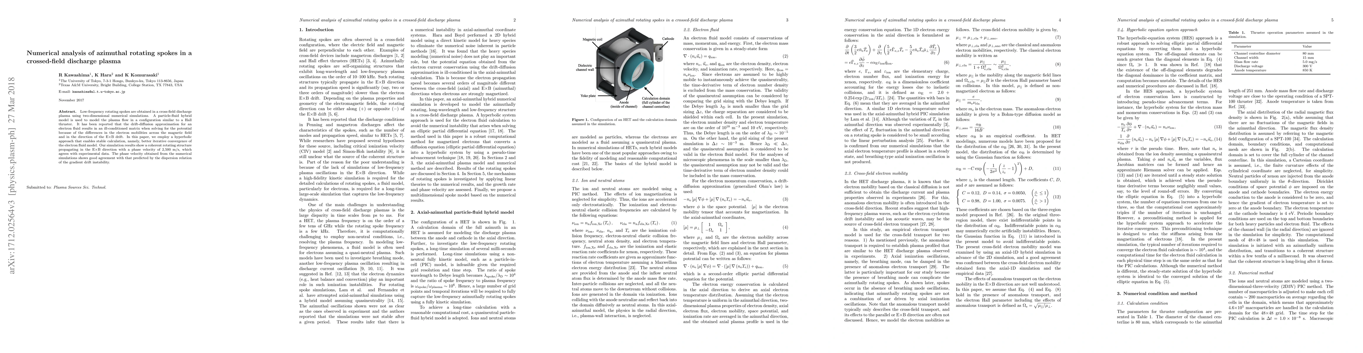 Low-frequency rotating spokes are obtained in a cross-field discharge plasma using two-dimensional numerical simulations. A particle-fluid hybrid model is used to model the plasma flow in a configuration similar to a Hall thruster. It has been reported that the drift-diffusion approximation for an electron fluid results in an ill-conditioned matrix when solving for the potential because of the differences in the electron mobilities across the magnetic field and in the direction of the E$\times$B drift. In this paper, we employ a hyperbolic approach that enables stable calculation, namely, better iterative convergence of the electron fluid model. Our simulation results show a coherent rotating structure propagating in the E$\times$B direction with a phase velocity of 2,500 m/s, which agrees with experimental data. The phase velocity obtained from the numerical simulations shows good agreement with that predicted by the dispersion relation of the gradient drift instability.