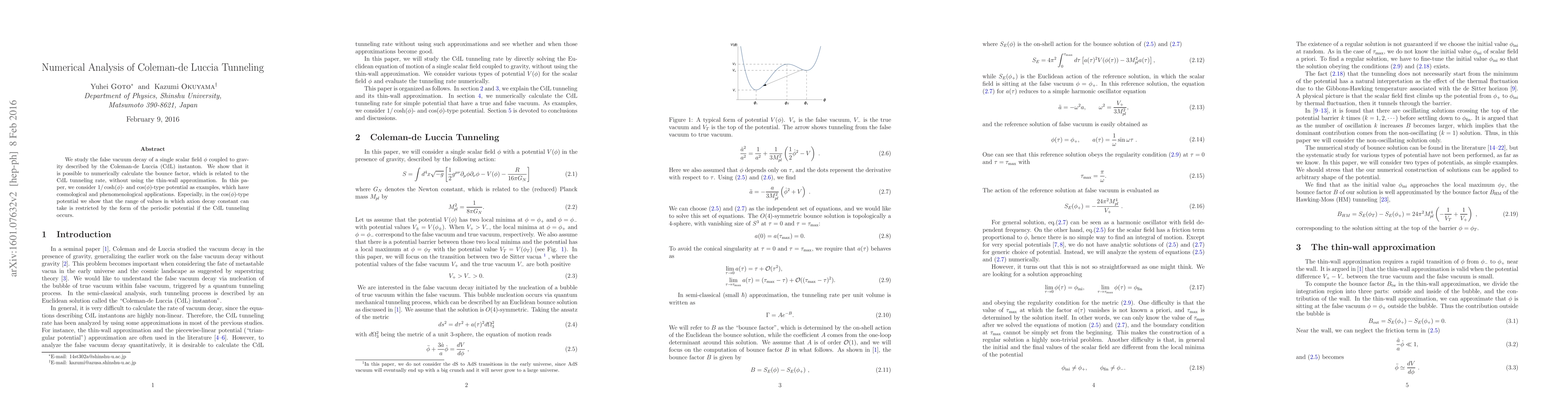 This paper numerically analyzes the false vacuum decay via Coleman-de Luccia tunneling in scalar field models, calculating the tunneling rate without the thin-wall approximation. It applies to $\cosh(\phi)$- and $\cos(\phi)$-type potentials, showing that axion decay constant values are constrained by the periodic potential in the latter.