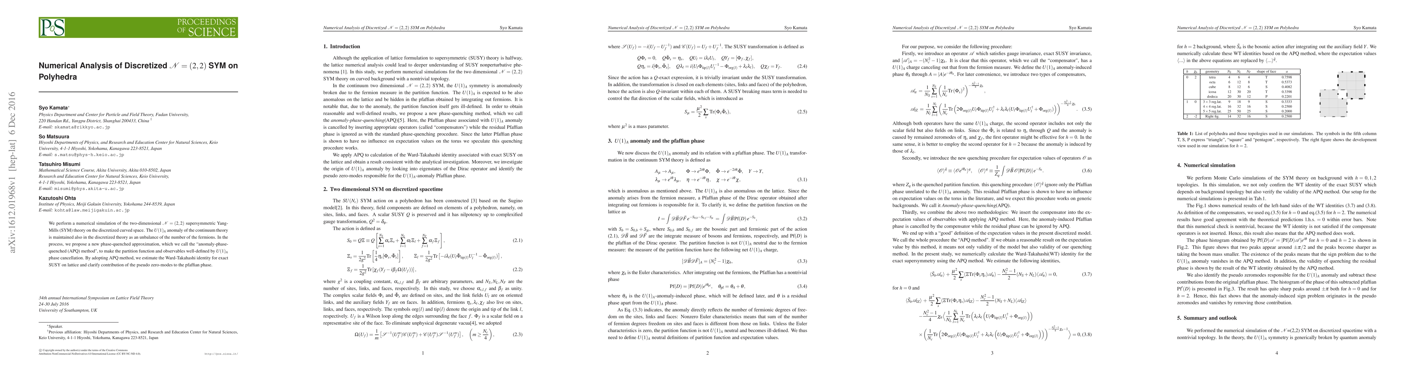 We perform a numerical simulation of the two-dimensional ${\cal N}=(2,2)$ supersymmetric Yang-Mills (SYM) theory on the discretized curved space. The $U(1)_{A}$ anomaly of the continuum theory is maintained also in the discretized theory as an unbalance of the number of the fermions. In the process, we propose a new phase-quenched approximation, which we call the "anomaly-phase-quenched (APQ) method", to make the partition function and observables well-defined by $U(1)_{A}$ phase cancellation. By adopting APQ method, we estimate the Ward-Takahashi identity for exact SUSY on lattice and clarify contribution of the pseudo zero-modes to the pfaffian phase.
