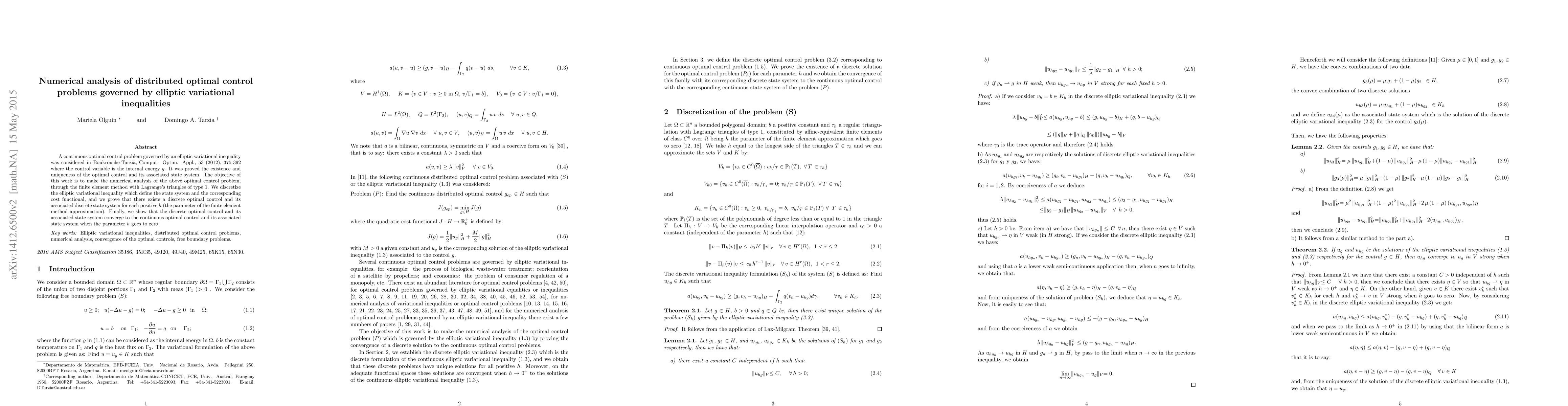 This paper numerically analyzes an optimal control problem governed by an elliptic variational inequality using the finite element method with Lagrange triangles of type 1. The authors prove the existence and convergence of discrete optimal control solutions, which converge to the continuous optimal control as the discretization parameter approaches zero.