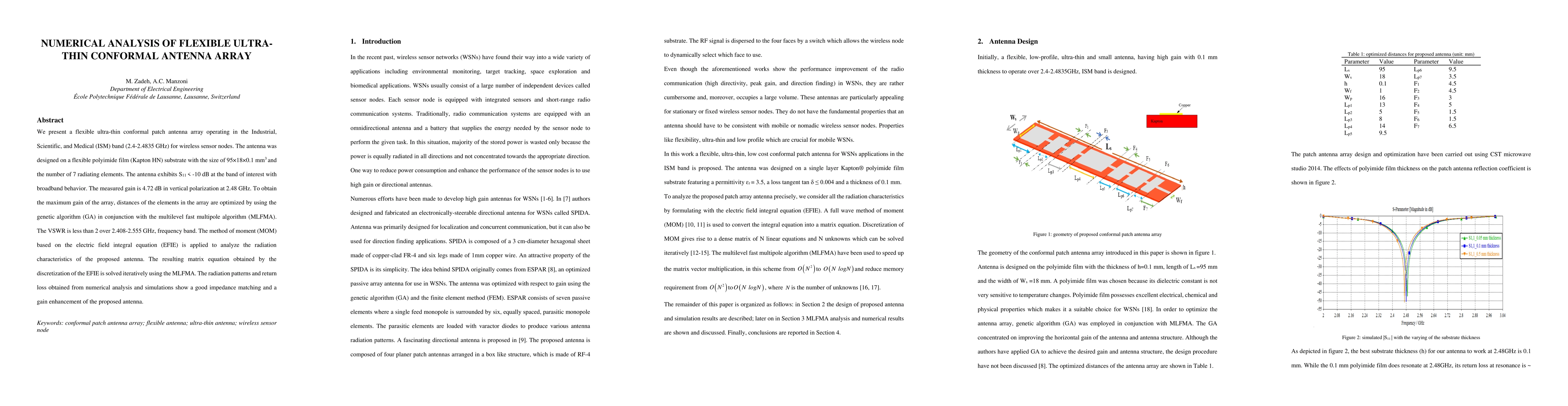 We present a flexible ultra-thin conformal patch antenna array operating in the Industrial, Scientific, and Medical (ISM) band (2.4-2.4835 GHz) for wireless sensor nodes. The antenna was designed on a flexible polyimide film (Kapton HN) substrate with the size of 95180.1 mm3 and the number of 7 radiating elements. The antenna exhibits S11 < -10 dB at the band of interest with broadband behavior. The measured gain is 4.72 dB in vertical polarization at 2.48 GHz. To obtain the maximum gain of the array, distances of the elements in the array are optimized by using the genetic algorithm (GA) in conjunction with the multilevel fast multipole algorithm (MLFMA). The VSWR is less than 2 over 2.408-2.555 GHz, frequency band. The method of moment (MOM) based on the electric field integral equation (EFIE) is applied to analyze the radiation characteristics of the proposed antenna. The resulting matrix equation obtained by the discretization of the EFIE is solved iteratively using the MLFMA. The radiation patterns and return loss obtained from numerical analysis and simulations show a good impedance matching and a gain enhancement of the proposed antenna.