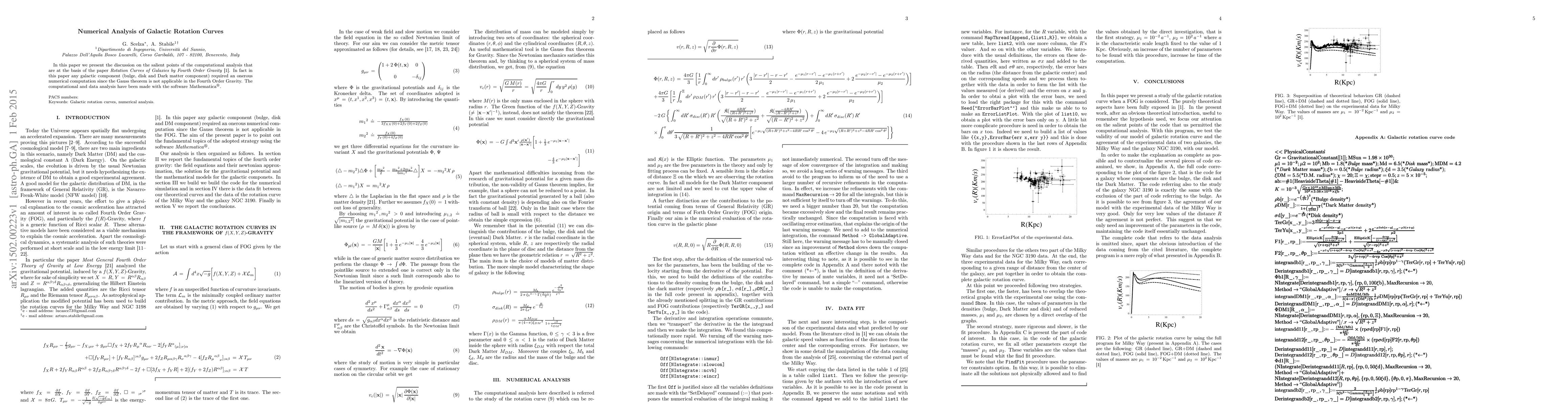 In this paper we present the discussion on the salient points of the computational analysis that are at the basis of the paper \emph{Rotation Curves of Galaxies by Fourth Order Gravity} \citep{StSc}. In fact in this paper any galactic component (bulge, disk and Dark matter component) required an onerous numerical computation since the Gauss theorem is not applicable in the Fourth Order Gravity. The computational and data analysis have been made with the software Mathematica$^\circledR$.