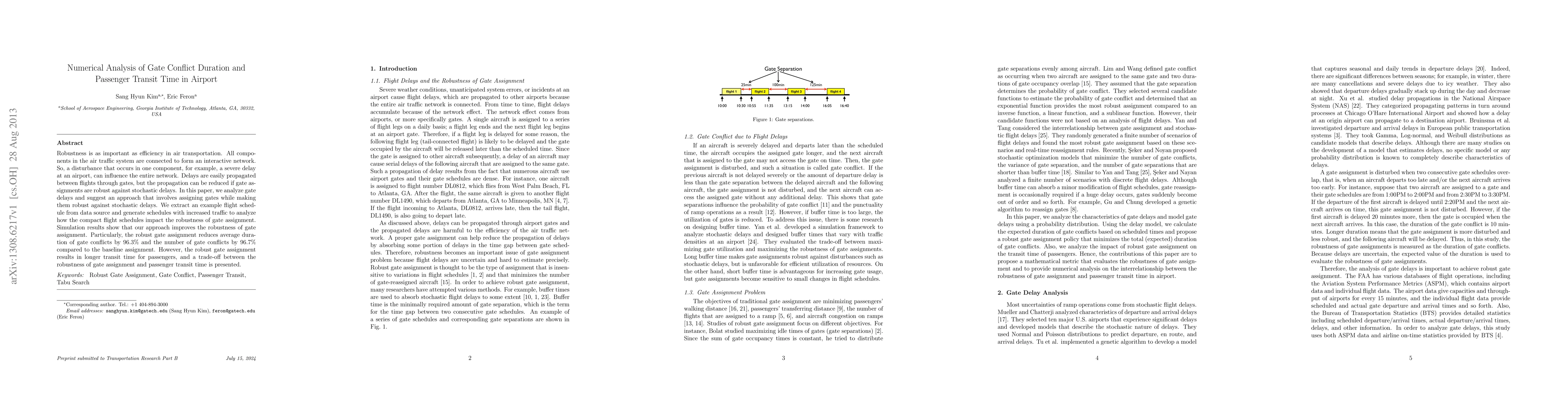 This study analyzes gate conflict duration and passenger transit time in airports to improve robustness of gate assignment against stochastic delays. It finds that a new approach reduces gate conflicts by 96.3% but increases passenger transit time.