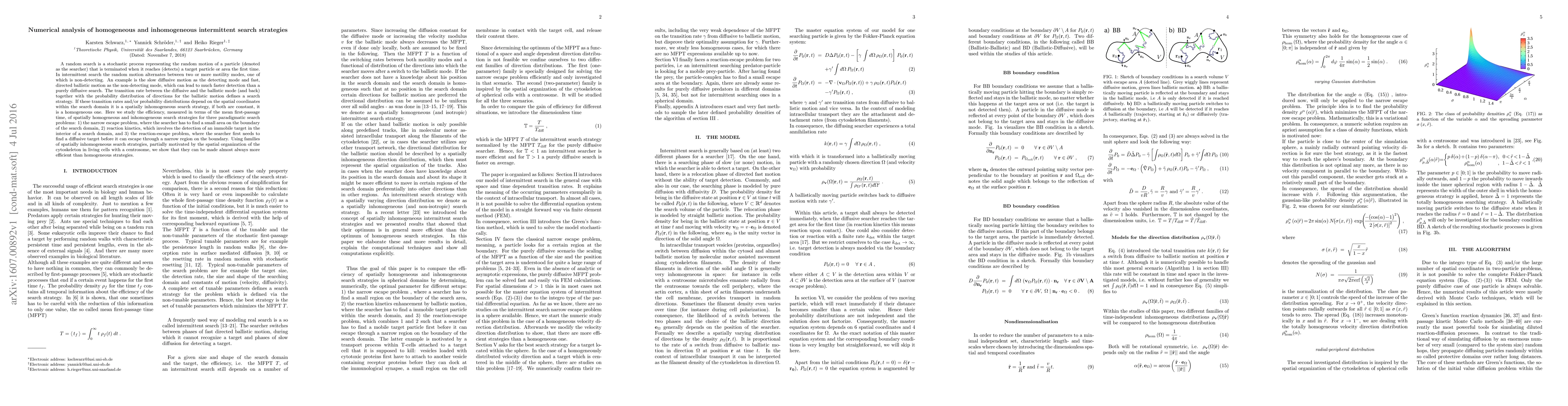 This paper numerically analyzes the efficiency of intermittent search strategies, comparing homogeneous and inhomogeneous approaches. It finds that inhomogeneous strategies, particularly those inspired by cellular structures, significantly reduce mean first-passage time across various search problems, outperforming homogeneous strategies.