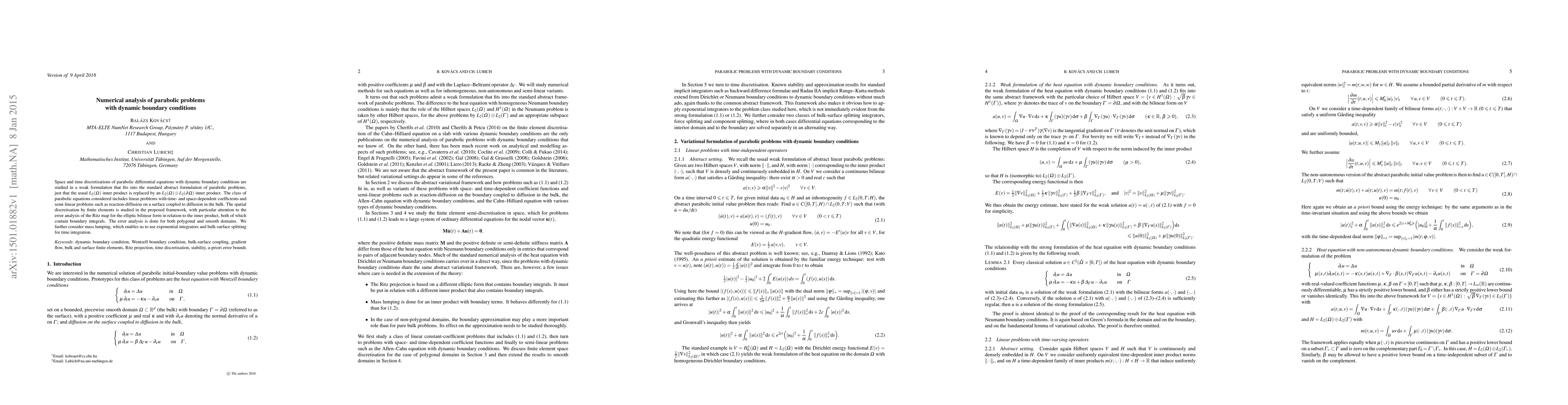 This paper studies the numerical analysis of parabolic differential equations with dynamic boundary conditions using a weak formulation. It focuses on spatial discretization via finite elements and error analysis, considering both polygonal and smooth domains, and explores mass lumping for efficient time integration.