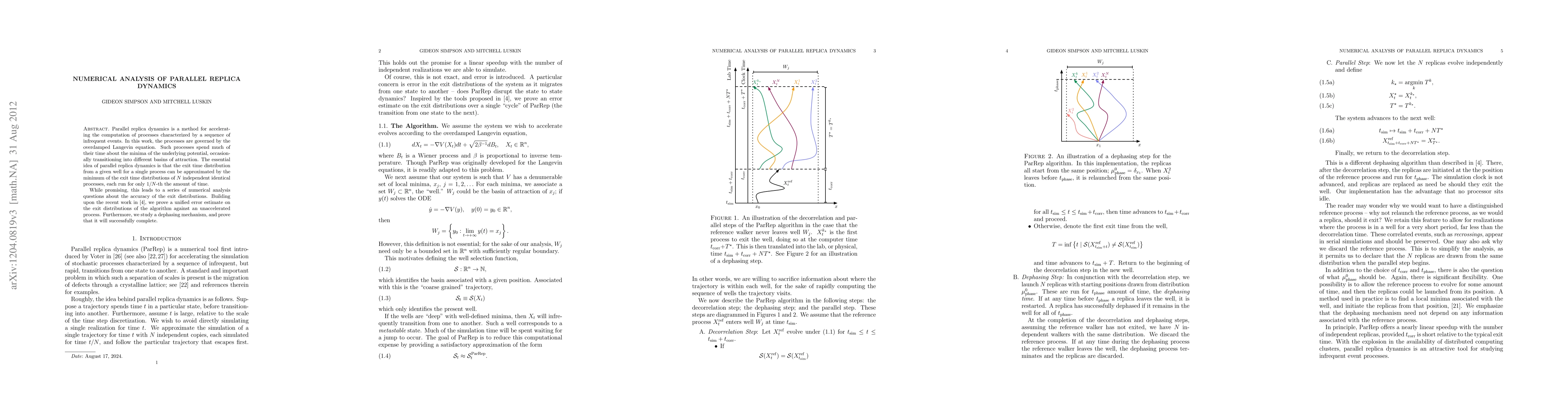 Parallel replica dynamics is a method for accelerating the computation of processes characterized by a sequence of infrequent events. In this work, the processes are governed by the overdamped Langevin equation. Such processes spend much of their time about the minima of the underlying potential, occasionally transitioning into different basins of attraction. The essential idea of parallel replica dynamics is that the exit time distribution from a given well for a single process can be approximated by the minimum of the exit time distributions of $N$ independent identical processes, each run for only 1/N-th the amount of time. While promising, this leads to a series of numerical analysis questions about the accuracy of the exit distributions. Building upon the recent work in Le Bris et al., we prove a unified error estimate on the exit distributions of the algorithm against an unaccelerated process. Furthermore, we study a dephasing mechanism, and prove that it will successfully complete.