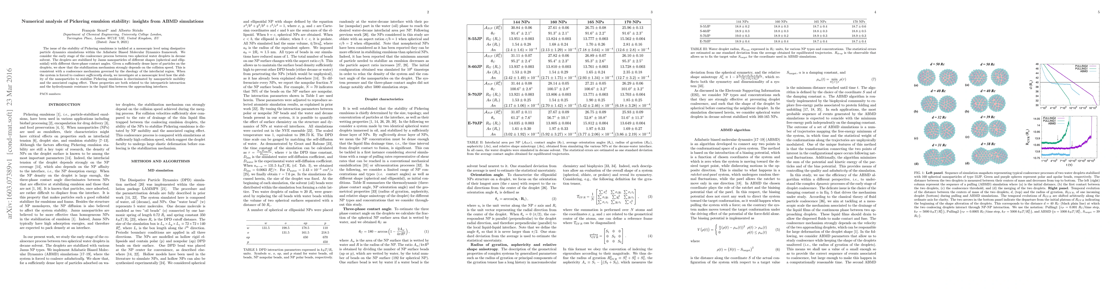 The issue of the stability of Pickering emulsions is tackled at a mesoscopic level using dissipative particle dynamics simulations within the Adiabatic Biased Molecular Dynamics framework. We consider the early stage of the coalescence process between two spherical water droplets in decane solvent. The droplets are stabilized by Janus nanoparticles of different shapes (spherical and ellipsoidal) with different three-phase contact angles. Given a sufficiently dense layer of particles on the droplets, we show that the stabilization mechanism strongly depends on the collision speed. This is consistent with a coalescence mechanism governed by the rheology of the interfacial region. When the system is forced to coalesce sufficiently slowly, we investigate at a mesoscopic level how the ability of the nanoparticles to stabilize Pickering emulsions is discriminated by nanoparticle mobility and the associated caging effect. These properties are both related to the interparticle interaction and the hydrodynamic resistance in the liquid film between the approaching interfaces.