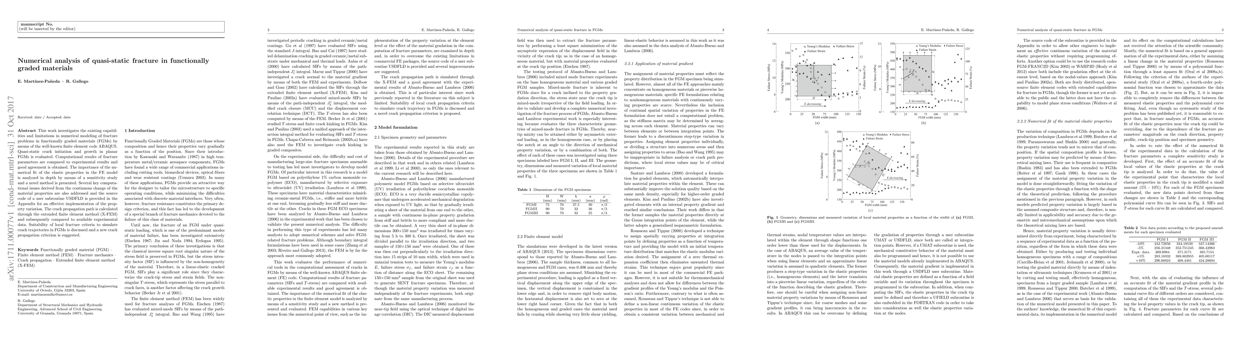 This study uses ABAQUS to numerically model quasi-static fracture in functionally graded materials, comparing computational fracture parameters with experimental results. A sensitivity analysis highlights the importance of accurately fitting elastic properties, and a new crack propagation criterion is proposed for better simulation of crack trajectories in FGMs.