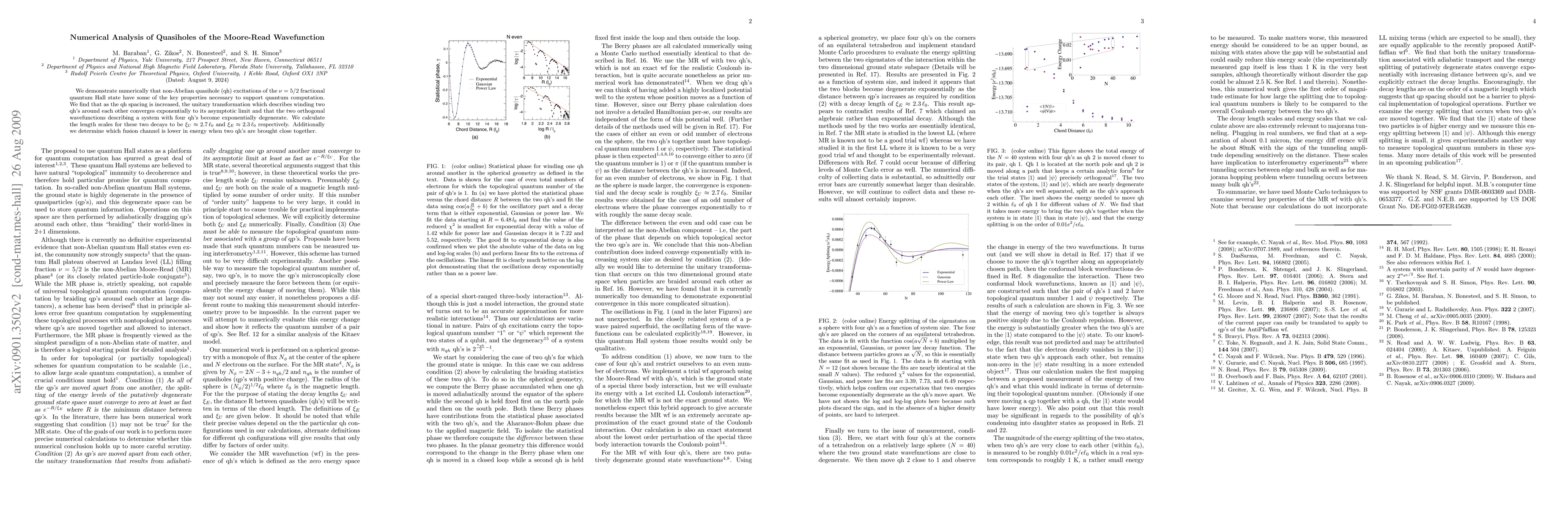 We demonstrate numerically that non-Abelian quasihole excitations of the $\nu = 5/2$ fractional quantum Hall state have some of the key properties necessary to support quantum computation. We find that as the quasihole spacing is increased, the unitary transformation which describes winding two quasiholes around each other converges exponentially to its asymptotic limit and that the two orthogonal wavefunctions describing a system with four quasiholes become exponentially degenerate. We calculate the length scales for these two decays to be $\xi_{U} \approx 2.7 \ell_0$ and $\xi_{E} \approx 2.3 \ell_0$ respectively. Additionally we determine which fusion channel is lower in energy when two quasiholes are brought close together.
