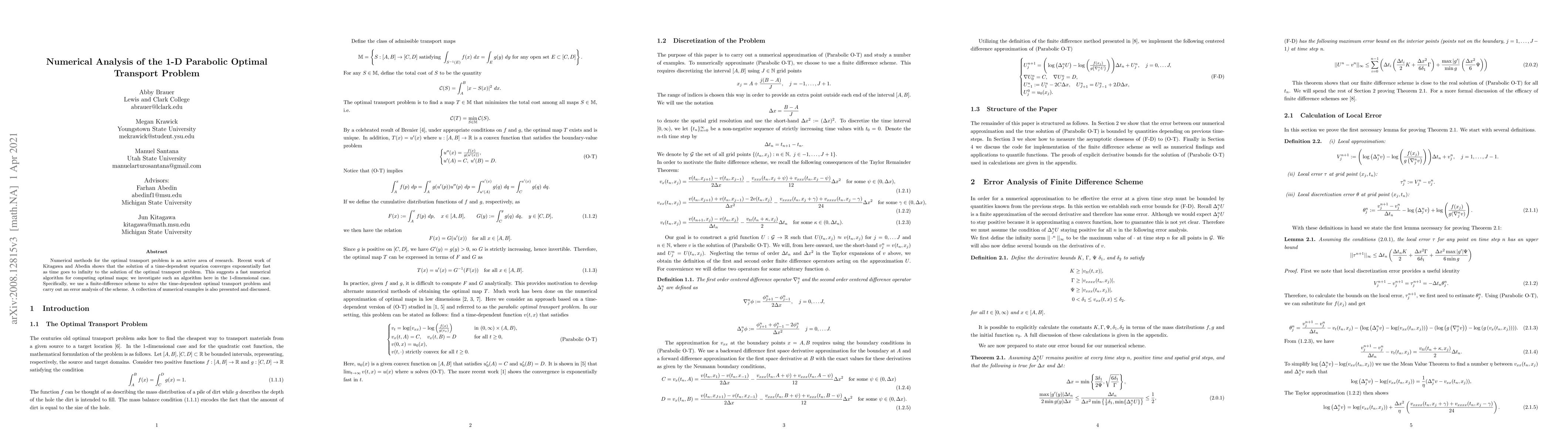 Numerical methods for the optimal transport problem is an active area of research. Recent work of Kitagawa and Abedin shows that the solution of a time-dependent equation converges exponentially fast as time goes to infinity to the solution of the optimal transport problem. This suggests a fast numerical algorithm for computing optimal maps; we investigate such an algorithm here in the 1-dimensional case. Specifically, we use a finite difference scheme to solve the time-dependent optimal transport problem and carry out an error analysis of the scheme. A collection of numerical examples is also presented and discussed.