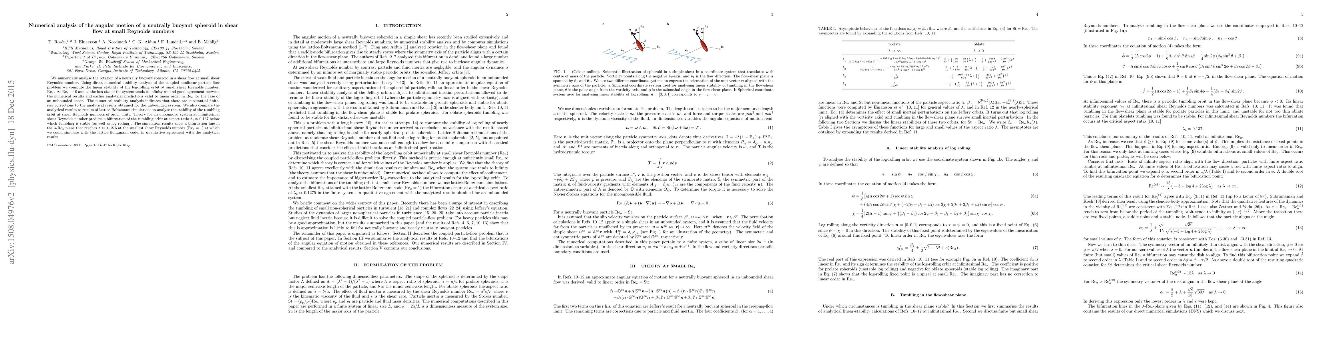 This paper numerically analyzes the angular motion of a neutrally buoyant spheroid in shear flow at small Reynolds numbers, finding substantial finite-size corrections to earlier analytical predictions. The study also compares lattice-Boltzmann simulations to theory, showing a bifurcation line in the aspect ratio-Reynolds number plane that aligns with analytical predictions.