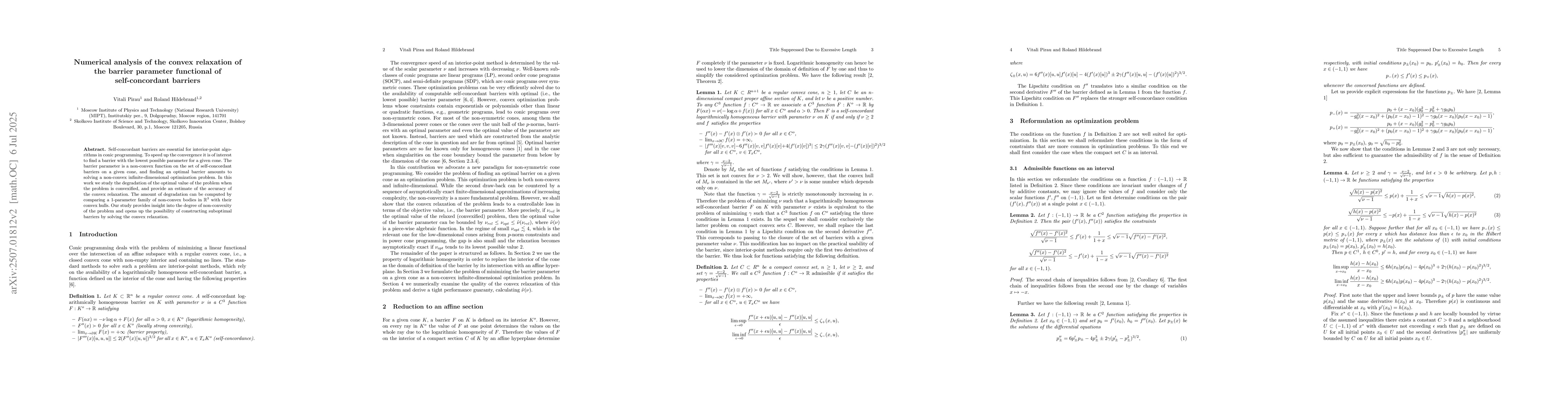 Self-concordant barriers are essential for interior-point algorithms in conic programming. To speed up the convergence it is of interest to find a barrier with the lowest possible parameter for a given cone. The barrier parameter is a non-convex function on the set of self-concordant barriers on a given cone, and finding an optimal barrier amounts to solving a non-convex infinite-dimensional optimization problem. In this work we study the degradation of the optimal value of the problem when the problem is convexified, and provide an estimate of the accuracy of the convex relaxation. The amount of degradation can be computed by comparing a 1-parameter family of non-convex bodies in $R^3$ with their convex hulls. Our study provides insight into the degree of non-convexity of the problem and opens up the possibility of constructing suboptimal barriers by solving the convex relaxation