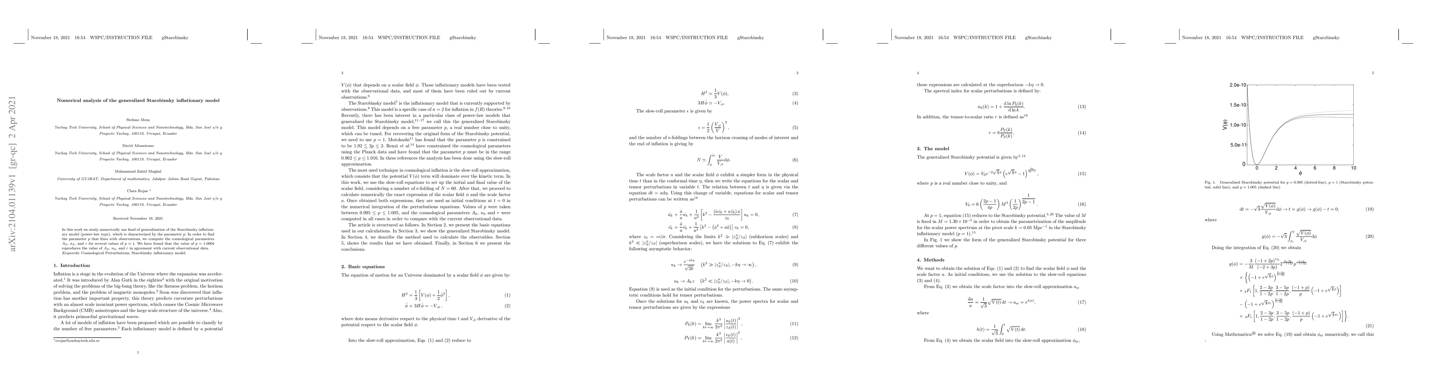 In this work we study numerically one kind of generalization of the Starobinsky inflationary model (power-law type), which is characterized by the parameter $p$. In order to find the parameter $p$ that fixes with observations, we compute the cosmological parameters $A_S$, $n_S$, and $r$ for several values of $p\simeq 1$. We have found that the value of $p=1.0004$ reproduces the value of $A_S$, $n_\sca$, and $r$ in agreement with current observational data.