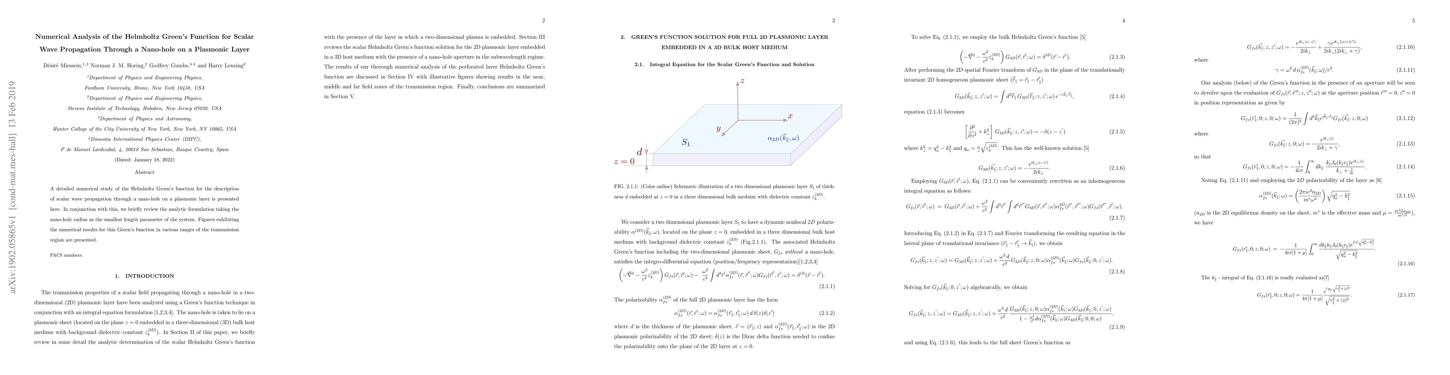 This paper presents a numerical analysis of the Helmholtz Green's function for scalar wave propagation through a nano-hole in a plasmonic layer. The study also includes an analytic review of the formulation, focusing on the nano-hole's radius as the smallest length parameter, and provides figures illustrating the numerical results across different transmission regions.