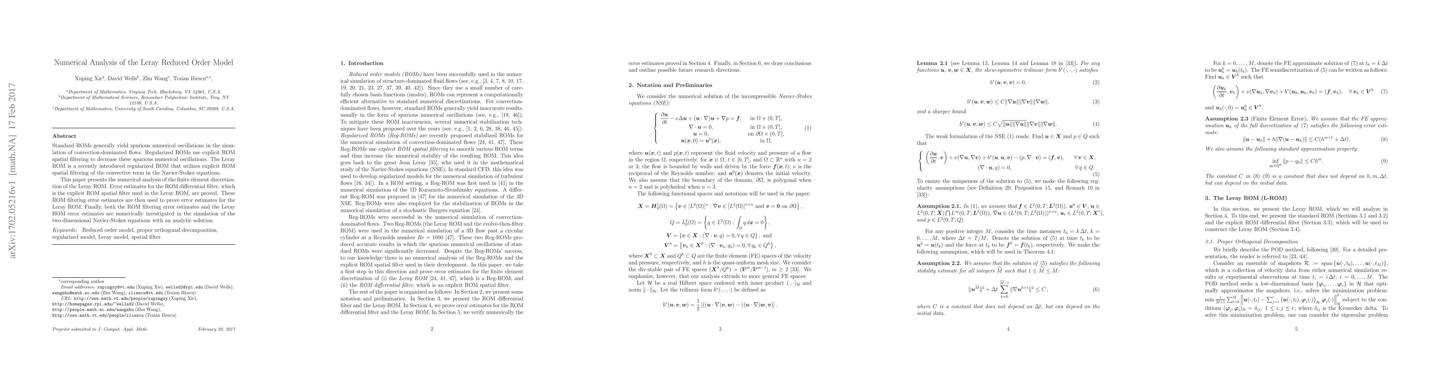 Standard ROMs generally yield spurious numerical oscillations in the simulation of convection-dominated flows. Regularized ROMs use explicit ROM spatial filtering to decrease these spurious numerical oscillations. The Leray ROM is a recently introduced regularized ROM that utilizes explicit ROM spatial filtering of the convective term in the Navier-Stokes equations. This paper presents the numerical analysis of the finite element discretization of the Leray ROM. Error estimates for the ROM differential filter, which is the explicit ROM spatial filter used in the Leray ROM, are proved. These ROM filtering error estimates are then used to prove error estimates for the Leray ROM. Finally, both the ROM filtering error estimates and the Leray ROM error estimates are numerically investigated in the simulation of the two-dimensional Navier-Stokes equations with an analytic solution.