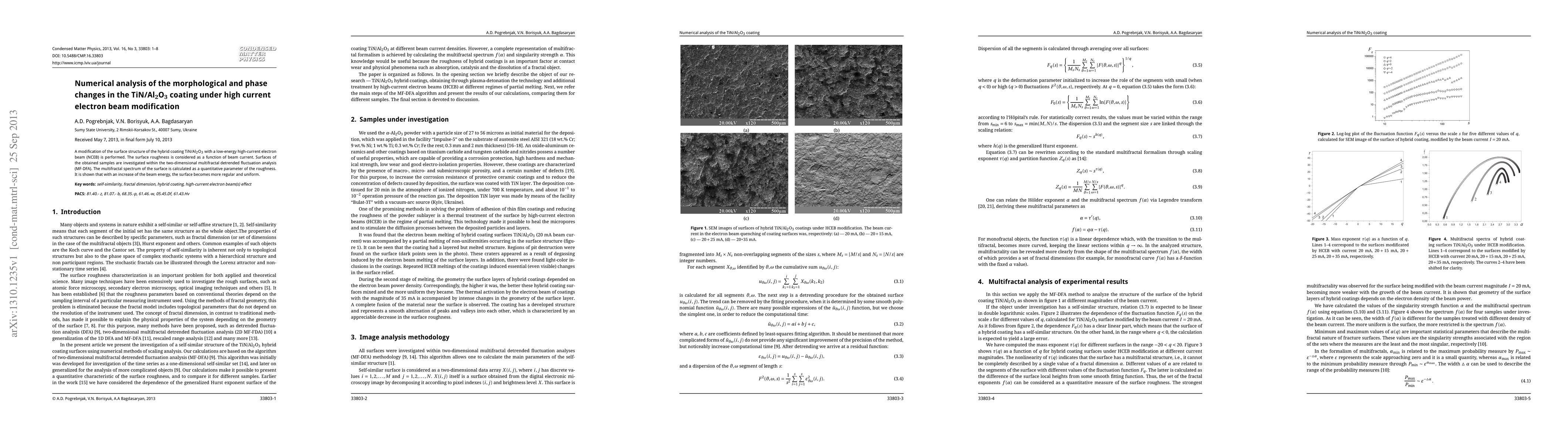 A modification of the surface structure of the hybrid coating TiN/Al_{2}O_{3} with a low-energy high-current electron beam (NCEB) is performed. The surface roughness is considered as a function of beam current. Surfaces of the obtained samples are investigated within the two-dimensional multifractal detrended fluctuation analysis (MF-DFA). The multifractal spectrum of the surface is calculated as a quantitative parameter of the roughness. It is shown that with an increase of the beam energy, the surface becomes more regular and uniform.
