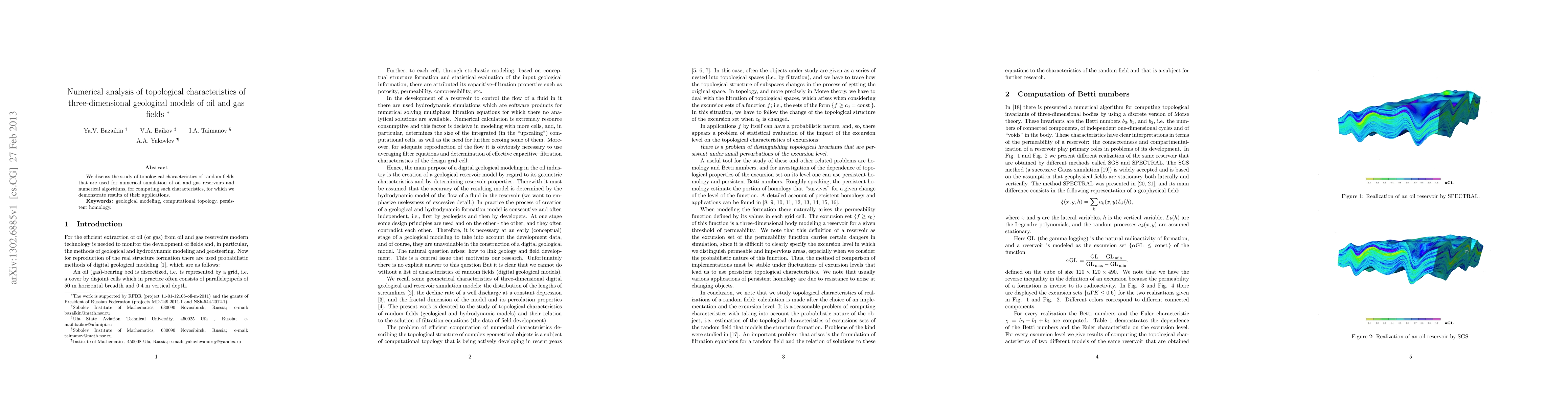 We discuss the study of topological characteristics of random fields that are used for numerical simulation of oil and gas reservoirs and numerical algorithms (see arXiv:1302.3669), for computing such characteristics, for which we demonstrate results of their applications.