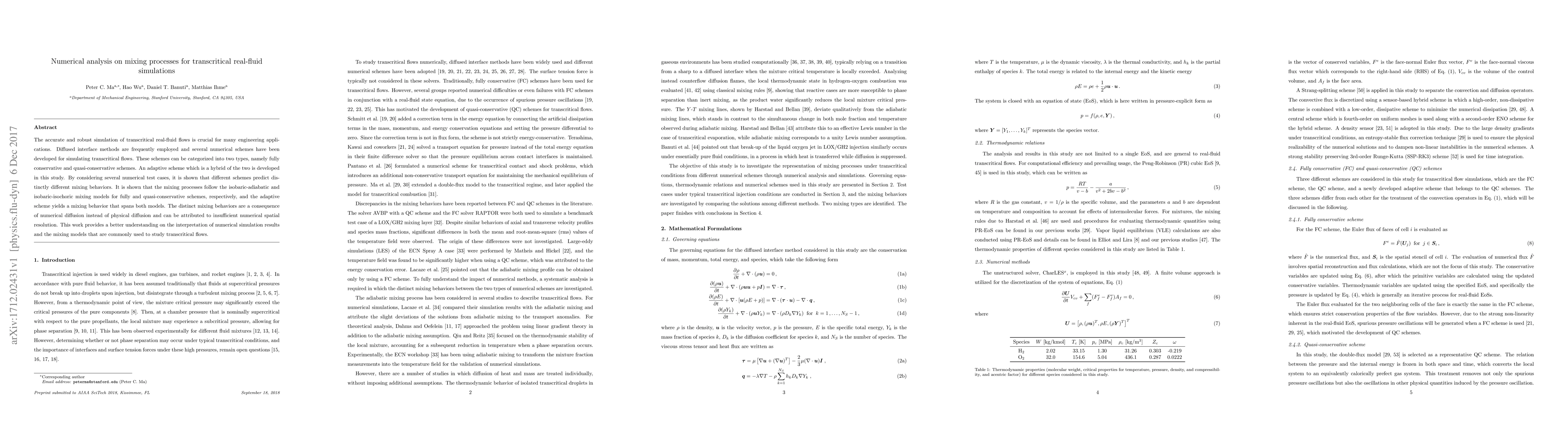 The accurate and robust simulation of transcritical real-fluid flows is crucial for many engineering applications. Diffused interface methods are frequently employed and several numerical schemes have been developed for simulating transcritical flows. These schemes can be categorized into two types, namely fully conservative and quasi-conservative schemes. An adaptive scheme which is a hybrid of the two is developed in this study. By considering several numerical test cases, it is shown that different schemes predict distinctly different mixing behaviors. It is shown that the mixing processes follow the isobaric-adiabatic and isobaric-isochoric mixing models for fully and quasi-conservative schemes, respectively, and the adaptive scheme yields a mixing behavior that spans both models. The distinct mixing behaviors are a consequence of numerical diffusion instead of physical diffusion and can be attributed to insufficient numerical spatial resolution. This work provides a better understanding on the interpretation of numerical simulation results and the mixing models that are commonly used to study transcritical flows.