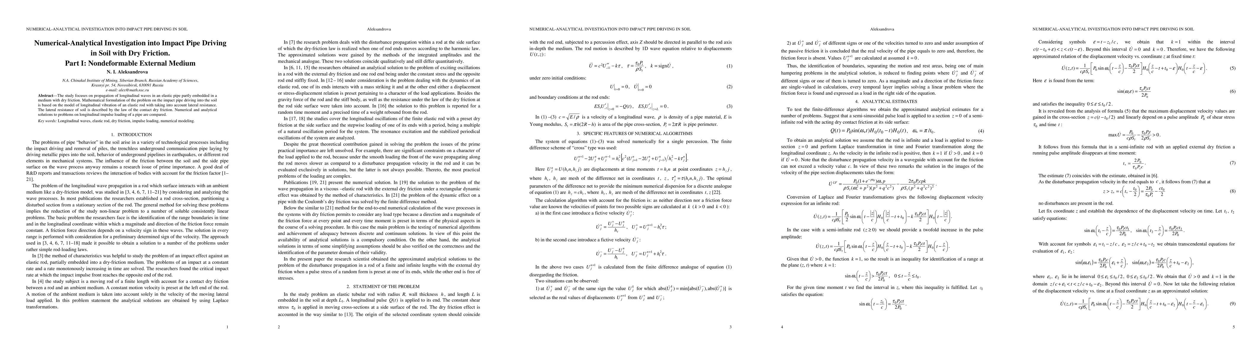 Researchers investigated how an impact pipe drives into dry soil with friction, using a mathematical model to simulate wave propagation in the pipe. Their findings compare numerical and analytical solutions for impact loading of pipes in such conditions.