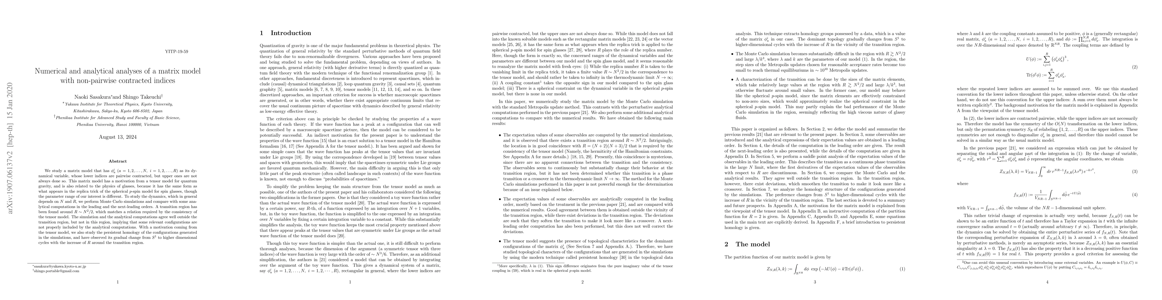 We study a matrix model that has $\phi_a^i\ (a=1,2,\ldots,N,\ i=1,2,\ldots,R)$ as its dynamical variable, whose lower indices are pairwise contracted, but upper ones are not always done so. This matrix model has a motivation from a tensor model for quantum gravity, and is also related to the physics of glasses, because it has the same form as what appears in the replica trick of the spherical $p$-spin model for spin glasses, though the parameter range of our interest is different. To study the dynamics, which in general depends on $N$ and $R$, we perform Monte Carlo simulations and compare with some analytical computations in the leading and the next-leading orders. A transition region has been found around $R\sim N^2/2$, which matches a relation required by the consistency of the tensor model. The simulation and the analytical computations agree well outside the transition region, but not in this region, implying that some relevant configurations are not properly included by the analytical computations. With a motivation coming from the tensor model, we also study the persistent homology of the configurations generated in the simulations, and have observed its gradual change from $S^1$ to higher dimensional cycles with the increase of $R$ around the transition region.