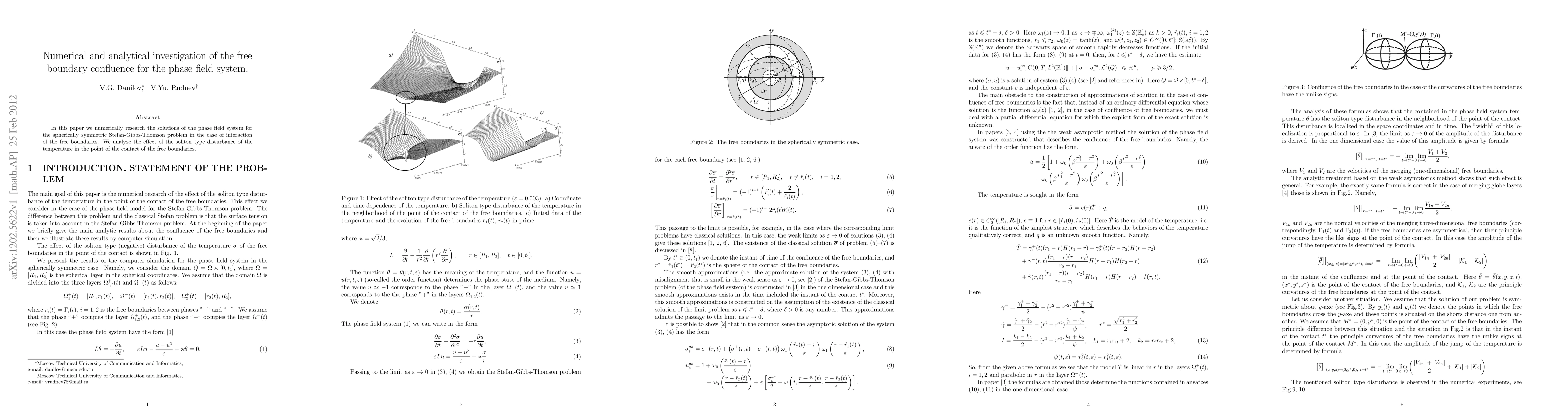In this paper we numerically research the solutions of the phase field system for the spherically symmetric Stefan-Gibbs-Thomson problem in the case of interaction of the free boundaries. We analyze the effect of the soliton type disturbance of the temperature in the point of the contact of the free boundaries.