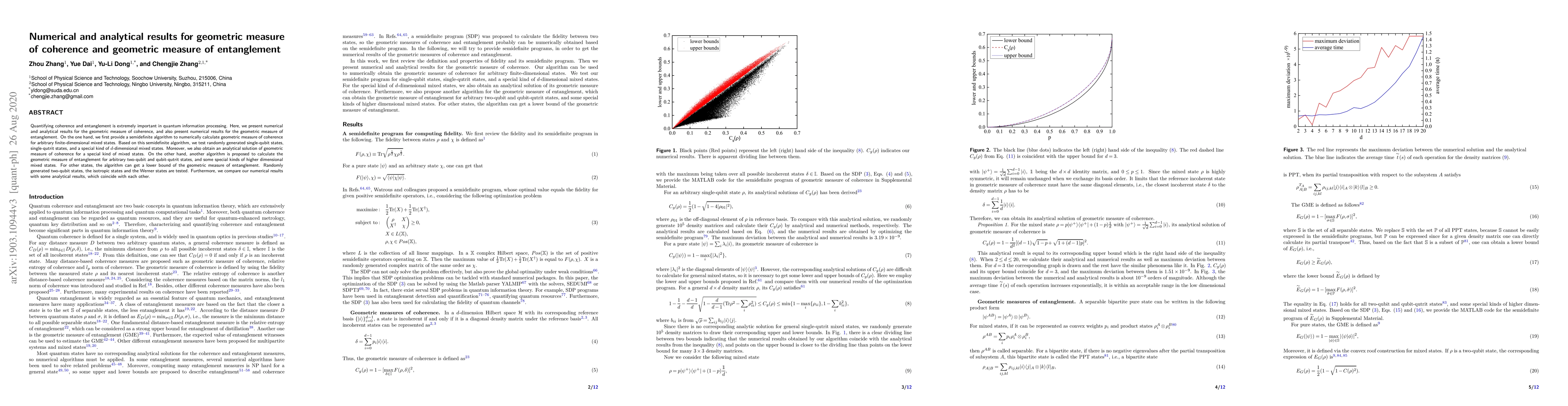 The paper presents numerical and analytical results for the geometric measure of coherence (CM) and geometric measure of entanglement (GME). It introduces a semidefinite algorithm for calculating CM for arbitrary finite-dimensional mixed states and tests it on single-qubit, single-qutrit, and special d-dimensional mixed states. For GME, another algorithm is proposed for arbitrary two-qubit and qubit-qutrit states, along with special higher-dimensional mixed states, providing lower bounds for other states.